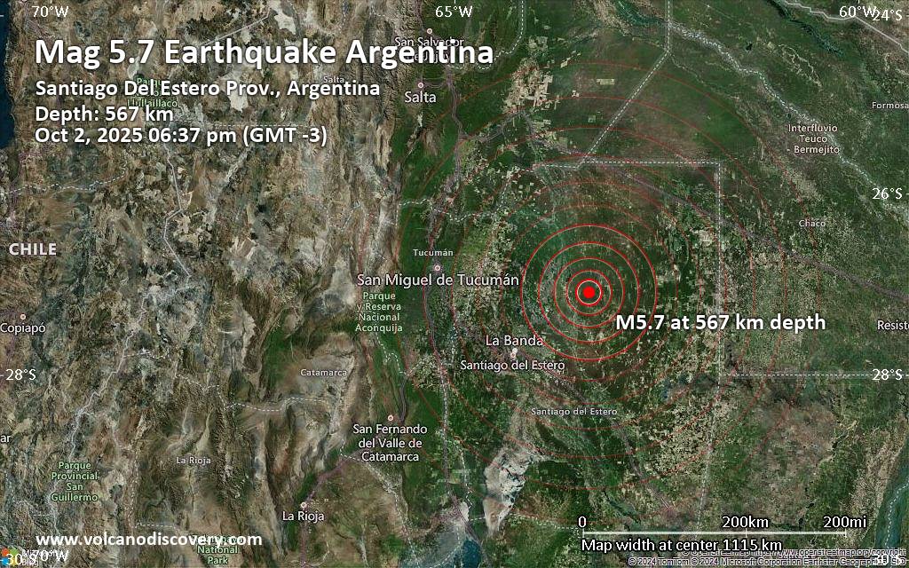 Moderate yet deep 5.7 quake hits near Santiago del Estero, Departamento de Capital, Santiago del Estero Province, Argentina A very deep magnitude 5.7 earthquake was reported early evening near Santiago del Estero, Departamento de Capital, Santiago del Estero Province, Argentina. According to the German Research Centre for Geosciences (GFZ), the quake hit on Thursday, October 2nd, 2025, at 6:37 pm local time at a great depth of 566.90 km. The strength of the earthquake may have been tempered by its relative great depth below the surface, which makes it feel weaker in absolute terms. The exact magnitude, epicenter, and depth of the quake might be revised within the next few hours or minutes as seismologists review data and refine their calculations, or as other agencies issue their report. Towns or cities near the epicenter where the quake might have been felt as very weak shaking include El Hoyo (pop. 2,200) located 13 km from the epicenter, Tintina (pop. 3,900) 63 km away, Campo Gallo (pop. 5,500) 75 km away, Suncho Corral (pop. 6,100) 94 km away, Clodomira (pop. 9,000) 95 km away, and Santiago del Estero (pop. 252,200) 120 km away. VolcanoDiscovery will automatically update magnitude and depth if these change and follow up if other significant news about the quake become available. If you’re in the area, please send us your experience through our reporting mechanism, either online or via our mobile app. This will help us provide more first-hand updates to anyone around the globe who wants to know more about this quake.