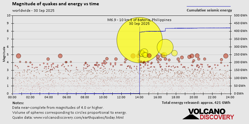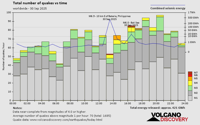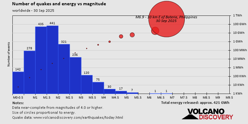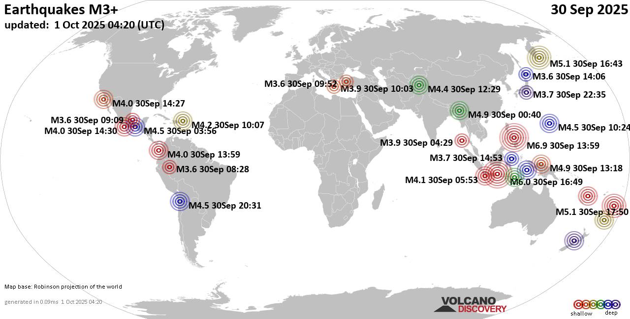 World Earthquake Report for Tuesday, 30 September 2025 Worldwide earthquakes above magnitude 3 during the past 24 hours on 1 Oct 2025 Summary: 2 quakes 6.0+, 7 quakes 5.0+, 45 quakes 4.0+, 175 quakes 3.0+, 508 quakes 2.0+ (737 total)Magnitude 6+: 2 earthquakes Magnitude 5+: 7 earthquakes Magnitude 4+: 45 earthquakes Magnitude 3+: 175 earthquakes Magnitude 2+: 508 earthquakes No quakes of magnitude 7 or higher 10 largest earthquakes in the world (30 Sep 2025)Tuesday, Sep 30, 2025, at 01:59 pm (Universal Time) - Tuesday, Sep 30, 2025, at 11:49 pm (GMT +7) - Tuesday, Sep 30, 2025, at 02:12 pm (Universal Time) - Tuesday, Sep 30, 2025, at 05:50 pm (Universal Time) - Tuesday, Sep 30, 2025, at 04:43 pm (Universal Time) - Tuesday, Sep 30, 2025, at 04:34 pm (Universal Time) - Tuesday, Sep 30, 2025, at 10:17 pm (Manila time) - Tuesday, Sep 30, 2025, at 02:39 pm (Universal Time) - Tuesday, Sep 30, 2025, at 02:33 pm (Universal Time) - Wednesday, Oct 1, 2025, at 12:29 pm (GMT +13) - Earthquakes reported feltTuesday, Sep 30, 2025, at 09:59 pm (GMT +8) - Tuesday, Sep 30, 2025, at 11:49 pm (GMT +7) - Tuesday, Sep 30, 2025, at 09:42 pm (Manila time) - Tuesday, Sep 30, 2025, at 02:12 pm (Universal Time) - Wednesday, Oct 1, 2025, at 12:15 am (Jakarta time) - Tuesday, Sep 30, 2025, at 10:10 am (Athens time) - Tuesday, Sep 30, 2025, at 02:33 pm (Universal Time) - Monday, Sep 29, 2025, at 09:23 pm (GMT -7) - Tuesday, Sep 30, 2025, at 02:39 pm (Universal Time) - Monday, Sep 29, 2025, at 07:19 pm (Caracas time) - Tuesday, Sep 30, 2025, at 07:10 am (Yangon time) - Tuesday, Sep 30, 2025, at 04:34 pm (Universal Time) - Tuesday, Sep 30, 2025, at 04:06 pm (Beirut time) - Tuesday, Sep 30, 2025, at 07:23 pm (GMT +7) - Tuesday, Sep 30, 2025, at 03:04 pm (GMT +7) - Wednesday, Oct 1, 2025, at 01:22 am (Jayapura time) - Tuesday, Sep 30, 2025, at 10:24 pm (Manila time) - Tuesday, Sep 30, 2025, at 12:53 pm (GMT +7) - Tuesday, Sep 30, 2025, at 11:59 pm (Manila time) - Monday, Sep 29, 2025, at 09:56 pm (Mexico City time) - Tuesday, Sep 30, 2025, at 05:52 pm (Rome time) - Wednesday, Oct 1, 2025, at 04:27 am (Manila time) - Tuesday, Sep 30, 2025, at 06:07 am (GMT -4) - Tuesday, Sep 30, 2025, at 05:34 pm (Athens time) - Tuesday, Sep 30, 2025, at 11:12 pm (Manila time) - Tuesday, Sep 30, 2025, at 10:12 pm (Jakarta time) - Tuesday, Sep 30, 2025, at 12:14 pm (GMT +8) - Wednesday, Oct 1, 2025, at 12:08 am (Jakarta time) - Tuesday, Sep 30, 2025, at 07:30 am (GMT -7) - Wednesday, Oct 1, 2025, at 07:01 am (Manila time) - Wednesday, Oct 1, 2025, at 01:41 am (Jayapura time) - Wednesday, Oct 1, 2025, at 06:26 am (Jakarta time) - Tuesday, Sep 30, 2025, at 06:06 am (Caracas time) - Wednesday, Oct 1, 2025, at 02:04 am (GMT +11) - Wednesday, Oct 1, 2025, at 12:56 am (Jakarta time) - Wednesday, Oct 1, 2025, at 12:04 am (Manila time) - Earthquake stats  https://www.volcanodiscovery.com/earthquake/news/282116/World-Earthquake-Report-for-Tuesday-30-September-2025.html