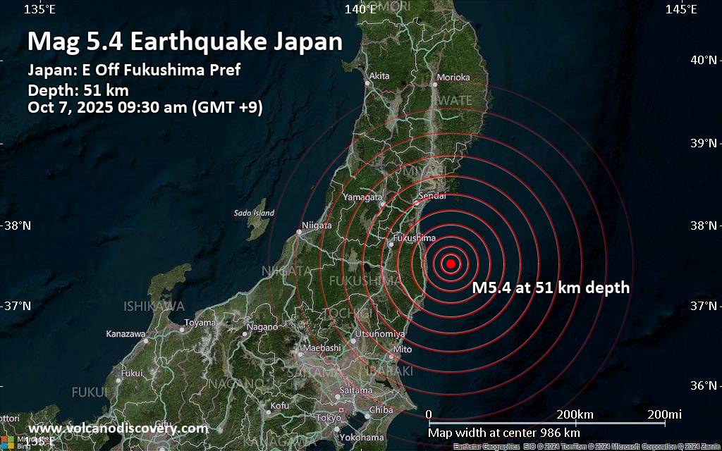 Significant magnitude 5.4 earthquake 39 km southeast of Minami-Soma, Japan A moderately shallow magnitude 5.4 earthquake was reported in the morning near Minami-Soma, Minamisōma Shi, Fukushima, Japan. According to Japan's National Research Institute for Earth Science and Disaster Resilience (NIED), the quake hit on Tuesday, October 7th, 2025, at 9:30 am local time at a moderately shallow depth of 51. km. The exact magnitude, epicenter, and depth of the quake might be revised within the next few hours or minutes as seismologists review data and refine their calculations, or as other agencies issue their report. A second report was later issued by the citizen-seismograph network of RaspberryShake, which listed it as a magnitude 4.9 earthquake. Based on the preliminary seismic data, the quake was probably felt by many people in the area of the epicenter. It should not have caused significant damage, other than objects falling from shelves, broken windows, etc. In Minami-Soma (pop. 59,000) located 39 km from the epicenter, the quake should have been felt as light shaking. Weak shaking might have been felt in Soma (pop. 34,900) located 51 km from the epicenter, Iwaki (pop. 357,300) 70 km away, Date (pop. 59,600) 86 km away, Fukushima (pop. 294,200) 86 km away, Fukushima (pop. 294,200) 86 km away, Koriyama (pop. 327,700) 91 km away, and Sukagawa (pop. 75,000) 94 km away. VolcanoDiscovery will automatically update magnitude and depth if these change and follow up if other significant news about the quake become available. If you’re in the area, please send us your experience through our reporting mechanism, either online or via our mobile app. This will help us provide more first-hand updates to anyone around the globe who wants to know more about this quake.