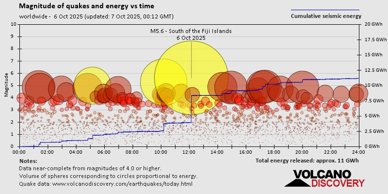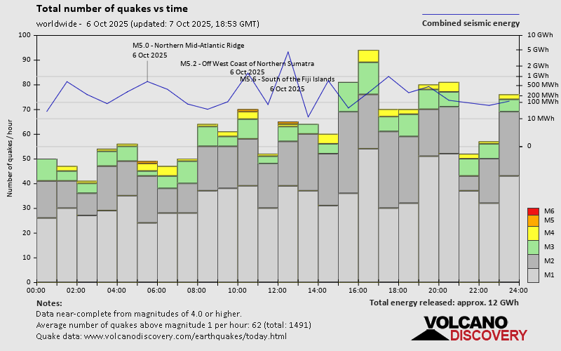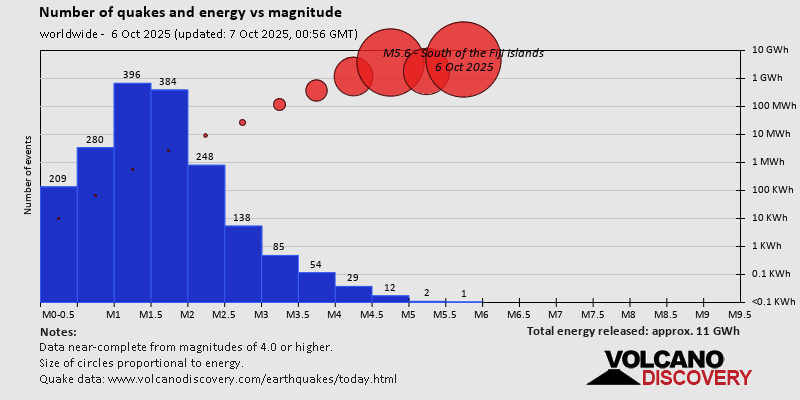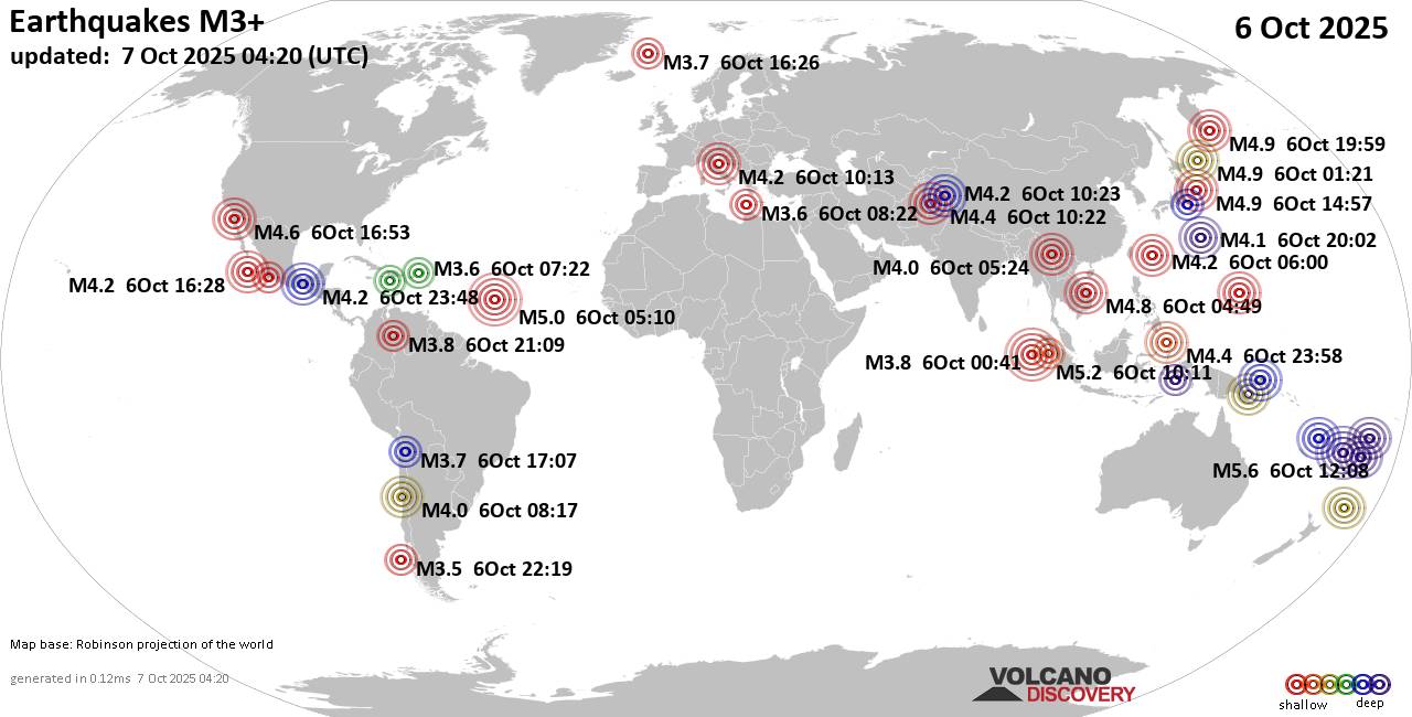 World Earthquake Report for Monday, 6 October 2025 Worldwide earthquakes above magnitude 3 during the past 24 hours on 7 Oct 2025 Summary: 3 quakes 5.0+, 41 quakes 4.0+, 139 quakes 3.0+, 386 quakes 2.0+ (569 total)Magnitude 5+: 3 earthquakes Magnitude 4+: 41 earthquakes Magnitude 3+: 139 earthquakes Magnitude 2+: 386 earthquakes No quakes of magnitude 6 or higher 10 largest earthquakes in the world (6 Oct 2025)Tuesday, Oct 7, 2025, at 12:08 am (GMT +12) - Monday, Oct 6, 2025, at 04:11 pm (GMT +6) - Monday, Oct 6, 2025, at 02:10 am (GMT -3) - Tuesday, Oct 7, 2025, at 06:59 am (GMT +11) - Tuesday, Oct 7, 2025, at 04:22 am (GMT +11) - Tuesday, Oct 7, 2025, at 03:11 am (GMT +10) - Monday, Oct 6, 2025, at 11:57 pm (GMT +9) - Monday, Oct 6, 2025, at 11:21 am (GMT +10) - Monday, Oct 6, 2025, at 11:20 pm (GMT +9) - Monday, Oct 6, 2025, at 11:49 am (Ho Chi Minh time) - Earthquakes reported feltMonday, Oct 6, 2025, at 12:13 pm (GMT +2) - Monday, Oct 6, 2025, at 09:53 am (Tijuana time) - Monday, Oct 6, 2025, at 01:18 pm (Casablanca time) - Monday, Oct 6, 2025, at 11:43 pm (Athens time) - Monday, Oct 6, 2025, at 09:57 pm (Manila time) - Monday, Oct 6, 2025, at 04:59 am (Istanbul time) - Monday, Oct 6, 2025, at 05:57 pm (Manila time) - Monday, Oct 6, 2025, at 05:57 pm (GMT +11) - Monday, Oct 6, 2025, at 03:50 pm (Manila time) - Tuesday, Oct 7, 2025, at 01:04 am (Paris time) - Monday, Oct 6, 2025, at 04:28 pm (Costa Rica time) - Monday, Oct 6, 2025, at 09:21 am (Costa Rica time) - Monday, Oct 6, 2025, at 11:57 pm (GMT +9) - Monday, Oct 6, 2025, at 07:56 pm (Manila time) - Earthquake stats  https://www.volcanodiscovery.com/earthquake/news/282691/World-Earthquake-Report-for-Monday-6-October-2025.html