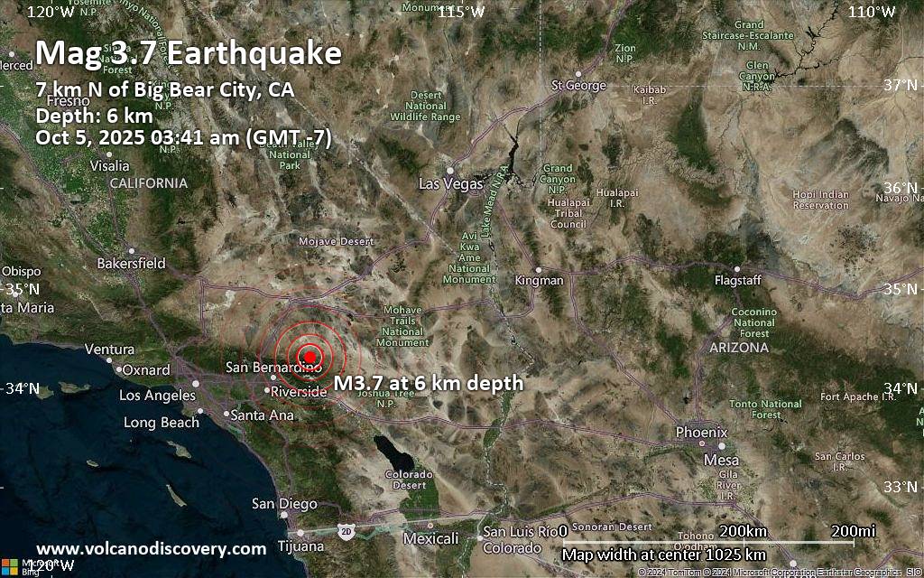 Small magnitude 3.7 earthquake 23 miles southeast of Apple Valley, California, United States An earthquake of magnitude 3.7 occurred only 4 minutes ago 23 miles southeast of Apple Valley, California, United States, the United States Geological Survey reported. The quake hit at a very shallow depth of 3.8 miles beneath the epicenter near Apple Valley, San Bernardino County, California, USA, early morning on Sunday, October 5th, 2025, at 3:41 am local time. The exact magnitude, epicenter, and depth of the quake might be revised within the next few hours or minutes as seismologists review data and refine their calculations, or as other agencies issue their report. A second report was later issued by The Incorporated Research Institutions for Seismology (IRIS), which listed it as a magnitude 3.7 earthquake as well. A third agency, the European-Mediterranean Seismological Centre (EMSC), reported the same quake at magnitude 3.7. Based on the preliminary seismic data, the quake should not have caused any significant damage, but was probably felt by many people as light vibration in the area of the epicenter. Weak shaking might have been felt in Big Bear City (pop. 12,300) located 4 miles from the epicenter. Other towns or cities near the epicenter where the quake might have been felt as very weak shaking include Apple Valley (pop. 72,200) located 23 miles from the epicenter, Yucaipa (pop. 53,300) 23 miles away, Highland (pop. 54,900) 24 miles away, Redlands (pop. 71,000) 26 miles away, Hesperia (pop. 93,300) 26 miles away, San Bernardino (pop. 216,100) 29 miles away, Victorville (pop. 122,200) 29 miles away, and Riverside (pop. 322,400) 40 miles away.