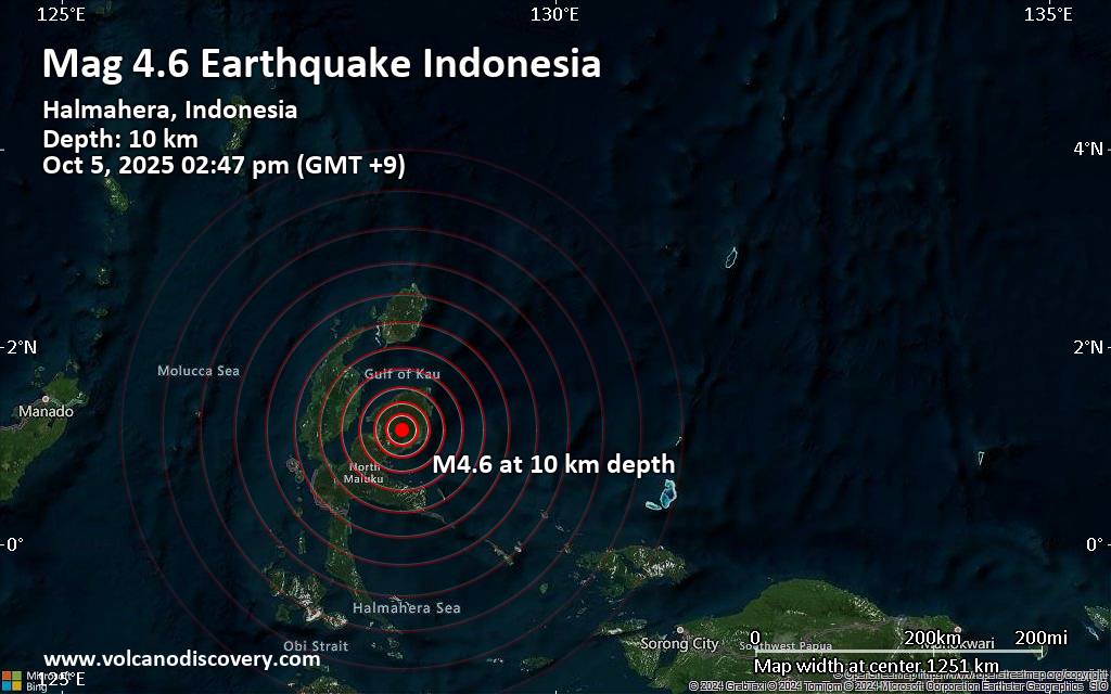 Earthquake data: Date & time: Oct 5, 2025 02:47 pm (GMT +9) local time (5 Oct 2025 05:47 GMT)Magnitude: 4.6 Depth: 10.00 km Epicenter latitude / longitude: 1.16°N / 128.44°E  ( East Halmahera Regency, North Maluku, Indonesia) Primary data source: BMKGhttps://www.volcanodiscovery.com/earthquake/news/282619/Moderate-magnitude-46-quake-hits-79-km-southeast-of-Tobelo-Indonesia-early-afternoon-.html