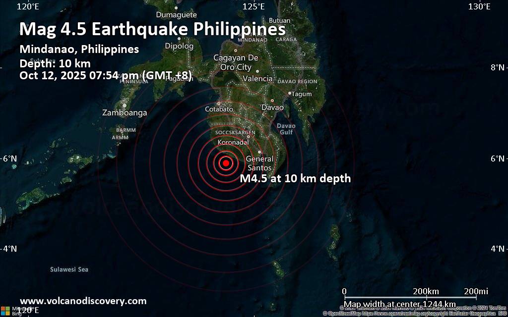 Earthquake data: Date & time: Oct 12, 2025 07:54 pm (GMT +8) local time (12 Oct 2025 11:54 GMT)Magnitude: 4.5 Depth: 10.00 km Epicenter latitude / longitude: 5.9°N / 124.38°E  (Province of Sarangani, Soccsksargen, Philippines) Primary data source: BMKGhttps://www.volcanodiscovery.com/earthquake/news/283279/Moderate-magnitude-45-quake-hits-73-km-southwest-of-Banga-Philippines-early-evening-.html