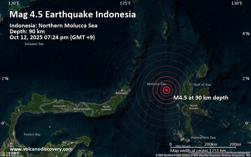 Earthquake data: Date & time: Oct 12, 2025 07:24 pm (GMT +9) local time (12 Oct 2025 10:24 GMT)Magnitude: 4.5 Depth: 90.00 km Epicenter latitude / longitude: 1.48°N / 126.84°E  ( North Maluku, Indonesia) Primary data source: BMKGhttps://www.volcanodiscovery.com/earthquake/news/283277/Magnitude-45-earthquake-strikes-near-Ternate-Kota-Ternate-North-Maluku-Indonesia.html
