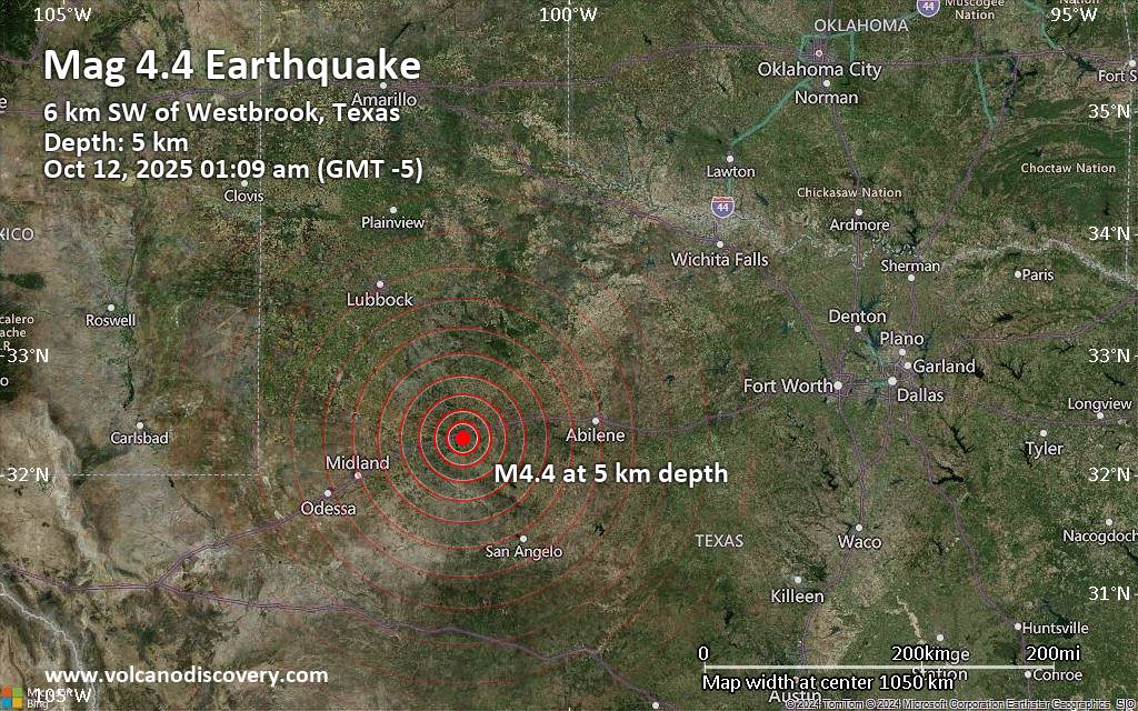 Earthquake data: Date & time: Oct 12, 2025 01:09 am (GMT -5) local time (12 Oct 2025 06:09 GMT)Magnitude: 4.4 Depth: 5.00 km Epicenter latitude / longitude: 32.31°N / 101.05°W  ( Mitchell County, Texas, United States) Primary data source: USGShttps://www.volcanodiscovery.com/earthquake/news/283269/Magnitude-44-earthquake-strikes-near-Big-Spring-Howard-County-Texas-USA.html
