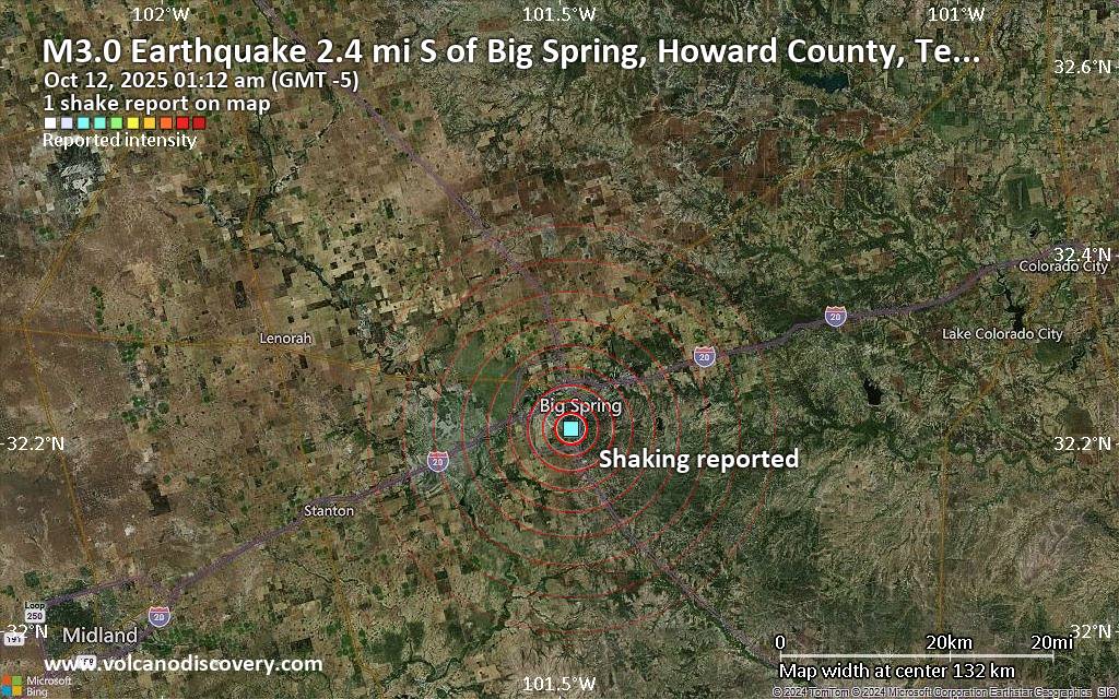Earthquake data: Date & time: Oct 12, 2025 01:12 am (GMT -5) local time (12 Oct 2025 06:12 GMT)Magnitude: unspecified Depth: unspecified Epicenter latitude / longitude: 32.22°N / 101.49°W  ( Texas, United States) Primary data source: VolcanoDiscoveryhttps://www.volcanodiscovery.com/earthquake/news/283267/Seismic-like-event-possible-earthquake-reported-few-minutes-ago-near-Big-Spring-Texas-USA.html