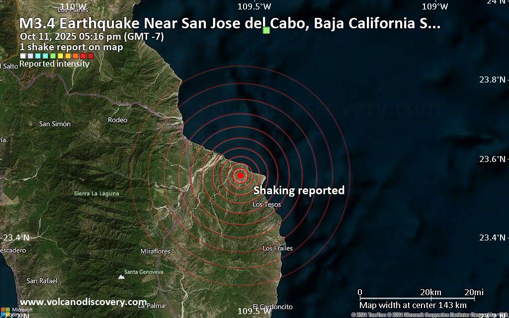 Earthquake data: Date & time: Oct 11, 2025 05:16 pm (GMT -7) local time (12 Oct 2025 00:16 GMT)Magnitude: unspecified Depth: unspecified Epicenter latitude / longitude: 23.56°N / 109.54°W  (Los Cabos, Mexico) Primary data source: VolcanoDiscoveryhttps://www.volcanodiscovery.com/earthquake/news/283251/Seismic-like-event-possible-earthquake-reported-about-10-minutes-ago-near-San-Jose-del-Cabo-Baja-Cal.html