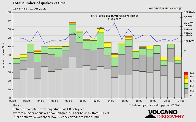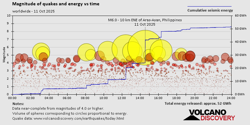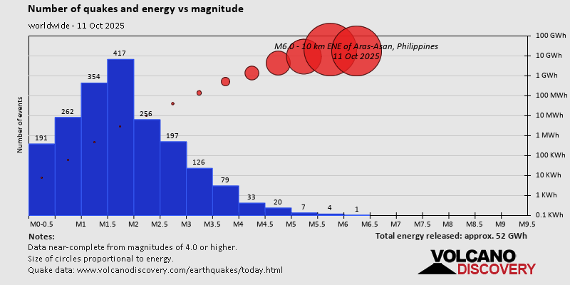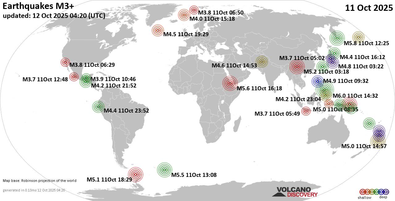 World Earthquake Report for Saturday, 11 October 2025 Worldwide earthquakes above magnitude 3 during the past 24 hours on 12 Oct 2025 Summary: 1 quake 6.0+, 11 quakes 5.0+, 53 quakes 4.0+, 185 quakes 3.0+, 423 quakes 2.0+ (673 total)Magnitude 6+: 1 earthquake Magnitude 5+: 11 earthquakes Magnitude 4+: 53 earthquakes Magnitude 3+: 185 earthquakes Magnitude 2+: 423 earthquakes No quakes of magnitude 7 or higher 10 largest earthquakes in the world (11 Oct 2025)Saturday, Oct 11, 2025, at 10:32 pm (GMT +8) - Saturday, Oct 11, 2025, at 11:25 pm (GMT +11) - Saturday, Oct 11, 2025, at 07:18 pm (GMT +3) - Saturday, Oct 11, 2025, at 11:08 am (GMT -2) - Saturday, Oct 11, 2025, at 06:27 pm (GMT +8) - Saturday, Oct 11, 2025, at 06:06 am (GMT -2) - Saturday, Oct 11, 2025, at 03:08 pm (GMT +12) - Saturday, Oct 11, 2025, at 07:01 pm (GMT +3) - Saturday, Oct 11, 2025, at 11:18 am (GMT +8) - Saturday, Oct 11, 2025, at 02:29 pm (GMT -4) - Earthquakes reported feltSaturday, Oct 11, 2025, at 10:32 pm (GMT +8) - Saturday, Oct 11, 2025, at 05:32 pm (Manila time) - Saturday, Oct 11, 2025, at 05:11 pm (Madrid time) - Saturday, Oct 11, 2025, at 03:08 pm (GMT +12) - Saturday, Oct 11, 2025, at 07:01 pm (GMT +3) - Saturday, Oct 11, 2025, at 06:27 pm (GMT +8) - Saturday, Oct 11, 2025, at 07:18 pm (GMT +3) - Saturday, Oct 11, 2025, at 07:53 pm (Karachi time) - Saturday, Oct 11, 2025, at 11:25 pm (GMT +11) - Saturday, Oct 11, 2025, at 09:54 pm (Manila time) - Saturday, Oct 11, 2025, at 10:30 pm (Addis Ababa time) - Saturday, Oct 11, 2025, at 09:38 pm (Addis Ababa time) - Saturday, Oct 11, 2025, at 09:02 am (Istanbul time) - Saturday, Oct 11, 2025, at 11:24 pm (GMT +9) - Saturday, Oct 11, 2025, at 01:07 pm (Jakarta time) - Saturday, Oct 11, 2025, at 05:09 am (Los Angeles time) - Saturday, Oct 11, 2025, at 06:52 pm (Lima time) - Saturday, Oct 11, 2025, at 08:47 pm (GMT +8) - Saturday, Oct 11, 2025, at 10:44 pm (Manila time) - Sunday, Oct 12, 2025, at 12:41 am (Addis Ababa time) - Saturday, Oct 11, 2025, at 11:32 am (GMT +8) - Saturday, Oct 11, 2025, at 08:19 pm (GMT +8) - Sunday, Oct 12, 2025, at 03:28 am (GMT +8) - Saturday, Oct 11, 2025, at 03:08 am (Mazatlan time) - Sunday, Oct 12, 2025, at 01:04 am (Port Moresby time) - Saturday, Oct 11, 2025, at 02:05 am (Los Angeles time) - Saturday, Oct 11, 2025, at 06:35 pm (GMT +10) - Saturday, Oct 11, 2025, at 03:28 am (Chicago time) - Sunday, Oct 12, 2025, at 12:17 am (Makassar time) - Saturday, Oct 11, 2025, at 09:20 am (Athens time) - Saturday, Oct 11, 2025, at 01:25 pm (GMT +8) - Saturday, Oct 11, 2025, at 02:29 pm (Kamchatka time) - Saturday, Oct 11, 2025, at 10:28 am (Manila time) - Earthquake stats  https://www.volcanodiscovery.com/earthquake/news/283189/World-Earthquake-Report-for-Saturday-11-October-2025.html