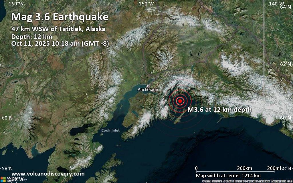 Earthquake data: Date & time: Oct 11, 2025 10:18 am (GMT -8) local time (11 Oct 2025 18:18 GMT)Magnitude: 3.6 Depth: 12.30 km Epicenter latitude / longitude: 60.64°N / 147.42°W  ( Chugach Census Area, Alaska, United States) Primary data source: USGShttps://www.volcanodiscovery.com/earthquake/news/283236/Magnitude-36-earthquake-strikes-near-Tatitlek-Chugach-Alaska-USA.html