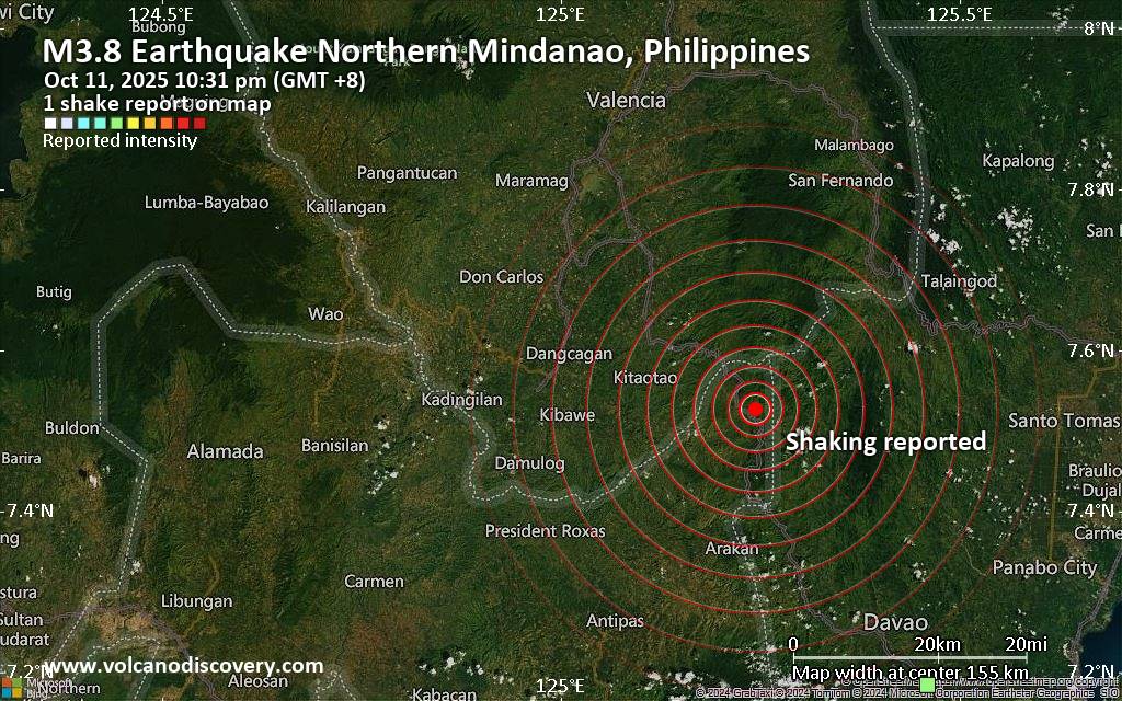 Earthquake data: Date & time: Oct 11, 2025 10:31 pm (GMT +8) local time (11 Oct 2025 14:31 GMT)Magnitude: unspecified Depth: unspecified Epicenter latitude / longitude: 7.53°N / 125.24°E  ( Davao, Philippines) Primary data source: VolcanoDiscoveryhttps://www.volcanodiscovery.com/earthquake/news/283220/Seismic-like-event-possible-earthquake-reported-few-minutes-ago-near-Davao-City-Davao-Region-Philipp.html