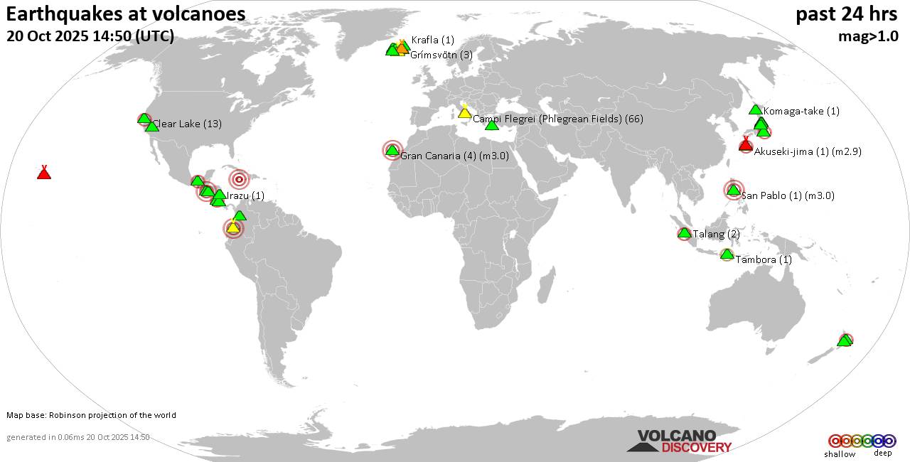 Volcano earthquake report for Monday, 20 Oct 2025 World map showing volcanoes with shallow (less than 50 km) earthquakes within 20 km radius during the past 24 hours on 20 Oct 2025 Number in brackets indicate nr of quakes. Quakes detected near: Akuseki-jima (1 quake mag 2.9), Arenal (1 quake mag 2.3), Azuma (1 quake mag 1.4), Bandai (1 quake mag 1.0), Bardarbunga (3 quakes between mag 0.9-1.0), Campi Flegrei (Phlegrean Fields) (72 quakes between mag 0.1-2.5) Cerro Bravo (1 quake mag 1.6), Cerro Negro de Mayasquer (1 quake mag 3.2), Clear Lake (13 quakes between mag 0.2-2.0), Comondu-La Purisima (1 quake mag 3.0), Coso (1 quake mag 1.0), El Chichón (6 quakes between mag 1.7-2.9), Gran Canaria (4 quakes between mag 0.9-3.0), Grímsvötn (5 quakes between mag 0.4-1.9), Hiuchi (4 quakes between mag 0.2-1.1), Irazu (1 quake mag 1.3), Katla (5 quakes between mag 0.1-1.4), Kilauea (1 quake mag 1.9), Kolumbo (2 quakes between mag 1.2-1.4), Komaga-take (1 quake mag 1.1), Krísuvík (10 quakes between mag 0.0-2.1), Leonard Range (1 quake mag 2.1), Loki-Fögrufjöll volcano (2 quakes between mag 0.7-1.0), Methana (1 quake mag 2.3), North Vate (1 quake mag 3.0), Okataina (Tarawera) (1 quake mag 2.2), San Pablo (1 quake mag 3.0), San Salvador (1 quake mag 3.4), Talang (2 quakes between mag 2.3-2.4), Tambora (1 quake mag 2.1), Taupo (1 quake mag 1.7), Tenorio (1 quake mag 2.0), To-shima (1 quake mag 2.1), Volcán Azul (1 quake mag 3.0) (updated 09h50) Note: Earthquakes within 20 km from and at depths less than 50 km under active volcanoes are reported. The list is not complete because many volcanoes are not monitored and/or seismic data in high resolution is not available publicly.