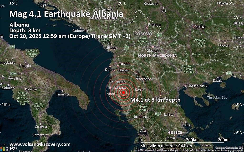 Moderate magnitude 4.1 earthquake 39 km north of Gjirokaster, Albania An earthquake of magnitude 4.1 occurred after midnight on Monday, October 20th, 2025, at 12:59 am local time near Gjirokaster, Bashkia Gjirokastër, Qarku i Gjirokastres, Albania, as reported by the European-Mediterranean Seismological Centre (EMSC). According to preliminary data, the quake was located at a very shallow depth of 2.50 km. Shallow earthquakes are felt more strongly than deeper ones as they are closer to the surface. Magnitude and other quake parameters can still change in the coming hours as the agency continues to process seismic data. Our monitoring service identified a second report from Italy's National Institute of Geophysics and Volcanology (INGV) which listed the quake at magnitude 4.1 as well. Other agencies reporting the same quake include The Seismological Survey of Serbia (SSS) at magnitude 4.2, the citizen-seismograph network of RaspberryShake at magnitude 4.3, the German Research Centre for Geosciences (GFZ) at magnitude 4.3, The Aristotle University of Thessaloniki Geophysical Lab. (AUTH) at magnitude 3.9, and The Seismological Laboratory of the University of Athens (UOA) at magnitude 4.0. Based on the preliminary seismic data, the quake was probably felt by many people in the area of the epicenter. It should not have caused significant damage, other than objects falling from shelves, broken windows, etc. In Vokopolë (pop. 170) located 10 km from the epicenter, and Memaliaj (pop. 5,000) 11 km away, the quake should have been felt as light shaking. Weak shaking might have been felt in Tepelene (pop. 12,000) located 15 km from the epicenter. Other towns or cities near the epicenter where the quake might have been felt as very weak shaking include Gjirokaster (pop. 23,400) located 39 km from the epicenter, Patos Fshat (pop. 22,700) 44 km away, Patos (pop. 16,000) 48 km away, Lushnje (pop. 41,500) 66 km away, Pogradec (pop. 61,500) 73 km away, and Elbasan (pop. 100,900) 77 km away.