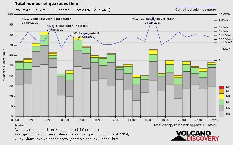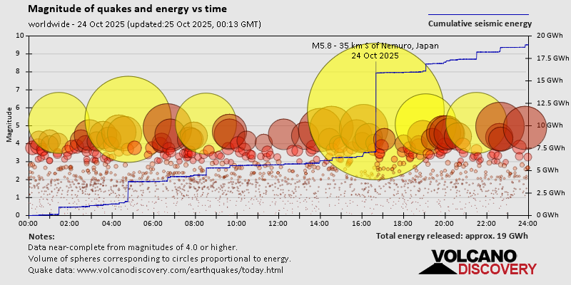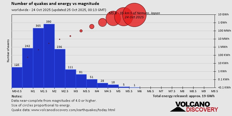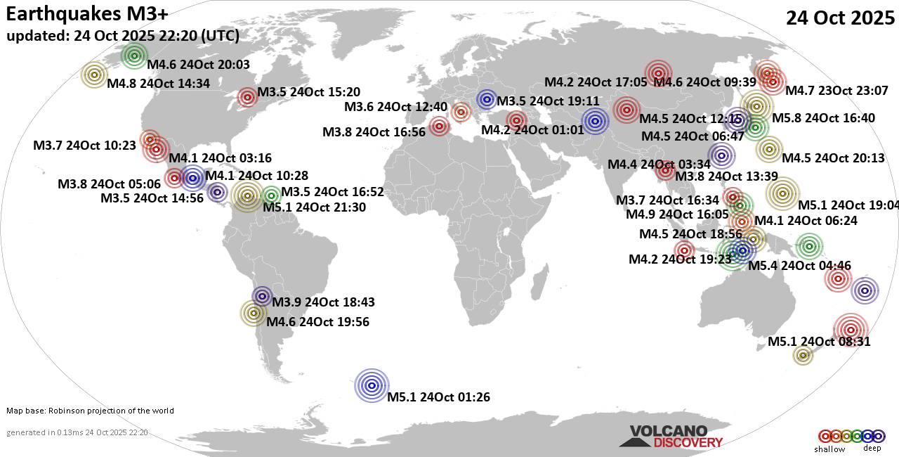 World Earthquake Report for Friday, 24 October 2025 Worldwide earthquakes above magnitude 3 during the past 24 hours on 24 Oct 2025 Summary: 6 quakes 5.0+, 40 quakes 4.0+, 128 quakes 3.0+, 343 quakes 2.0+ (517 total)This report is being updated every hour.Magnitude 5+: 6 earthquakes Magnitude 4+: 40 earthquakes Magnitude 3+: 128 earthquakes Magnitude 2+: 343 earthquakes No quakes of magnitude 6 or higher 10 largest earthquakes in the world (past 24 hours)Saturday, Oct 25, 2025, at 01:40 am (GMT +9) - Friday, Oct 24, 2025, at 12:46 pm (GMT +8) - Friday, Oct 24, 2025, at 05:30 pm (Caracas time) - Saturday, Oct 25, 2025, at 05:04 am (GMT +10) - Thursday, Oct 23, 2025, at 08:31 pm (GMT -12) - Thursday, Oct 23, 2025, at 11:26 pm (GMT -2) - Saturday, Oct 25, 2025, at 12:05 am (Manila time) - Friday, Oct 24, 2025, at 05:39 pm (GMT +11) - Friday, Oct 24, 2025, at 03:34 am (GMT -11) - Friday, Oct 24, 2025, at 09:59 pm (Manila time) - Earthquakes reported feltFriday, Oct 24, 2025, at 10:20 am (Toronto time) - Friday, Oct 24, 2025, at 09:59 pm (Manila time) - Friday, Oct 24, 2025, at 05:20 pm (Berlin time) - Friday, Oct 24, 2025, at 02:40 pm (Rome time) - Friday, Oct 24, 2025, at 03:47 pm (GMT +9) - Friday, Oct 24, 2025, at 05:30 pm (Caracas time) - Thursday, Oct 23, 2025, at 10:43 pm (Mazatlan time) - Friday, Oct 24, 2025, at 12:03 pm (Anchorage time) - Thursday, Oct 23, 2025, at 04:45 pm (Los Angeles time) - Friday, Oct 24, 2025, at 01:10 am (Madrid time) - Saturday, Oct 25, 2025, at 12:05 am (Manila time) - Friday, Oct 24, 2025, at 02:56 pm (GMT -5) - Saturday, Oct 25, 2025, at 01:40 am (GMT +9) - Thursday, Oct 23, 2025, at 08:12 pm (Los Angeles time) - Thursday, Oct 23, 2025, at 03:32 pm (Los Angeles time) - Thursday, Oct 23, 2025, at 04:27 pm (Los Angeles time) - Thursday, Oct 23, 2025, at 05:11 pm (Los Angeles time) - Friday, Oct 24, 2025, at 12:46 pm (GMT +8) - Thursday, Oct 23, 2025, at 04:37 pm (Los Angeles time) - Thursday, Oct 23, 2025, at 07:28 pm (Bogota time) - Friday, Oct 24, 2025, at 05:56 am (Costa Rica time) - Saturday, Oct 25, 2025, at 02:28 am (Manila time) - Friday, Oct 24, 2025, at 01:42 pm (Athens time) - Earthquake stats  https://www.volcanodiscovery.com/earthquake/news/284677/World-Earthquake-Report-for-Friday-24-October-2025.html