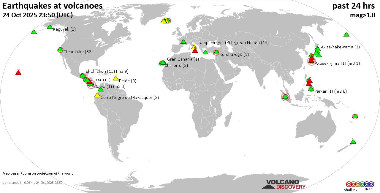 Volcano earthquake report for Friday, 24 Oct 2025 World map showing volcanoes with shallow (less than 50 km) earthquakes within 20 km radius during the past 24 hours on 24 Oct 2025 Number in brackets indicate nr of quakes. Quakes detected near: Abu (27 quakes between mag 0.2-1.5), Akagi (2 quakes between mag 0.2-1.4), Akita-Yake-yama (1 quake mag 1.1), Akuseki-jima (1 quake mag 3.1), Akutan (2 quakes between mag 0.0-1.4), Bardarbunga (10 quakes between mag 0.2-2.0) Barva (1 quake mag 3.0), Brennisteinsfjöll (6 quakes between mag 0.3-1.0), Bulusan (1 quake mag 1.9), Campi Flegrei (Phlegrean Fields) (16 quakes between mag 0.1-1.7), Canlaon (3 quakes between mag 2.1-3.0), Cerro Negro de Mayasquer (2 quakes between mag 1.3-1.5), Cerro Singüil (1 quake mag 2.0), Chaîne des Puys (2 quakes between mag 1.1-1.3), Clear Lake (35 quakes between mag 0.2-2.1), El Chichón (18 quakes between mag 1.7-2.9), El Hierro (2 quakes between mag 2.1-2.3), Epi (1 quake mag 2.7), Gran Canaria (1 quake mag 1.1), Irazu (1 quake mag 1.7), Iriga (1 quake mag 1.9), Kaguyak (2 quakes between mag 1.6-1.8), Katla (3 quakes between mag 0.6-1.2), Kilauea (2 quakes between mag 1.7-1.9), Kirishima (3 quakes between mag 0.5-1.4), Kolumbo (2 quakes between mag 1.4-1.5), Koruhüyüğü (1 quake mag 2.0), Kozushima (1 quake mag 1.9), Krísuvík (8 quakes between mag 0.3-1.2), Kurikoma (2 quakes between mag 0.1-1.1), Laguna Aramuaca (3 quakes between mag 1.9-2.1), Ljósufjöll (4 quakes between mag 0.3-2.0), Masaya (1 quake mag 1.8), Norikura (3 quakes between mag 0.1-1.3), Okataina (Tarawera) (1 quake mag 1.8), Parker (1 quake mag 2.6), Pelée (9 quakes between mag 0.4-1.4), San Diego (1 quake mag 1.2), Svartsengi (1 quake mag 1.0), Tandikat (1 quake mag 3.0), Tenerife (1 quake mag 3.0), Tenorio (8 quakes between mag 0.7-3.3), To-shima (2 quakes between mag 1.4-1.5), Yake-dake (3 quakes between mag 0.1-1.1) (updated 21h50) Note: Earthquakes within 20 km from and at depths less than 50 km under active volcanoes are reported. The list is not complete because many volcanoes are not monitored and/or seismic data in high resolution is not available publicly.