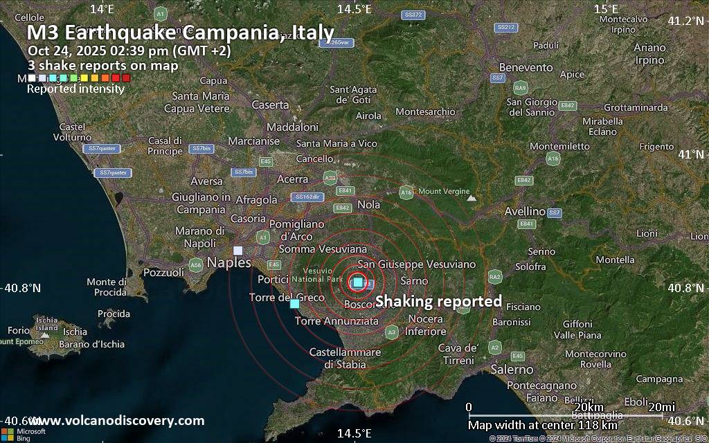 Earthquake data: Date & time: Oct 24, 2025 02:39 pm (GMT +2) local time (24 Oct 2025 12:39 GMT)Magnitude: unspecified Depth: unspecified Epicenter latitude / longitude: 40.81°N / 14.51°E  ( Campania, Italy) Primary data source: VolcanoDiscoveryhttps://www.volcanodiscovery.com/earthquake/news/284748/Seismic-like-event-possible-earthquake-reported-few-minutes-ago-near-Naples-Campania-Italy.html