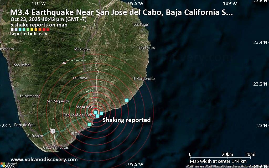 Earthquake data: Date & time: Oct 23, 2025 10:42 pm (GMT -7) local time (24 Oct 2025 05:42 GMT)Magnitude: unspecified Depth: unspecified Epicenter latitude / longitude: 23.06°N / 109.7°W  ( Estado de Baja California Sur, Mexico) Primary data source: VolcanoDiscoveryhttps://www.volcanodiscovery.com/earthquake/news/284684/Seismic-like-event-possible-earthquake-reported-few-minutes-ago-near-San-Jose-del-Cabo-Baja-Californ.html