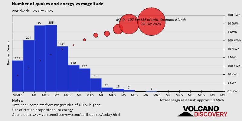World Earthquake Report for Saturday, 25 October 2025 Worldwide earthquakes above magnitude 3 during the past 24 hours on 26 Oct 2025 Summary: 1 quake 6.0+, 7 quakes 5.0+, 32 quakes 4.0+, 167 quakes 3.0+, 343 quakes 2.0+ (550 total)Magnitude 6+: 1 earthquake Magnitude 5+: 7 earthquakes Magnitude 4+: 32 earthquakes Magnitude 3+: 167 earthquakes Magnitude 2+: 343 earthquakes No quakes of magnitude 7 or higher 10 largest earthquakes in the world (25 Oct 2025)Sunday, Oct 26, 2025, at 10:28 am (GMT +11) - Saturday, Oct 25, 2025, at 10:31 pm (GMT +6) - Saturday, Oct 25, 2025, at 12:29 pm (GMT -5) - Saturday, Oct 25, 2025, at 10:13 pm (GMT +11) - Saturday, Oct 25, 2025, at 07:45 pm (GMT +8) - Friday, Oct 24, 2025, at 09:34 pm (GMT -9) - Saturday, Oct 25, 2025, at 07:12 pm (GMT +11) - Saturday, Oct 25, 2025, at 01:13 am (GMT -9) - Saturday, Oct 25, 2025, at 08:18 am (GMT -7) - Saturday, Oct 25, 2025, at 11:56 am (Jakarta time) - Earthquakes reported feltSaturday, Oct 25, 2025, at 09:49 pm (Rome time) - Saturday, Oct 25, 2025, at 05:45 pm (Costa Rica time) - Saturday, Oct 25, 2025, at 10:56 am (Guatemala time) - Saturday, Oct 25, 2025, at 12:57 pm (Athens time) - Saturday, Oct 25, 2025, at 02:34 pm (Manila time) - Saturday, Oct 25, 2025, at 10:18 am (Rome time) - Saturday, Oct 25, 2025, at 05:11 am (Bucharest time) - Sunday, Oct 26, 2025, at 02:33 am (Athens time) - Saturday, Oct 25, 2025, at 10:13 pm (GMT +11) - Saturday, Oct 25, 2025, at 03:36 pm (Kolkata time) - Saturday, Oct 25, 2025, at 07:50 am (GMT -7) - Saturday, Oct 25, 2025, at 09:08 pm (Rome time) - Sunday, Oct 26, 2025, at 12:51 am (Rome time) - Saturday, Oct 25, 2025, at 05:30 am (Los Angeles time) - Saturday, Oct 25, 2025, at 04:57 am (Bogota time) - Saturday, Oct 25, 2025, at 05:09 pm (GMT -5) - Sunday, Oct 26, 2025, at 06:42 am (Manila time) - Saturday, Oct 25, 2025, at 11:56 am (Jakarta time) - Earthquake stats  https://www.volcanodiscovery.com/earthquake/news/284844/World-Earthquake-Report-for-Saturday-25-October-2025.html