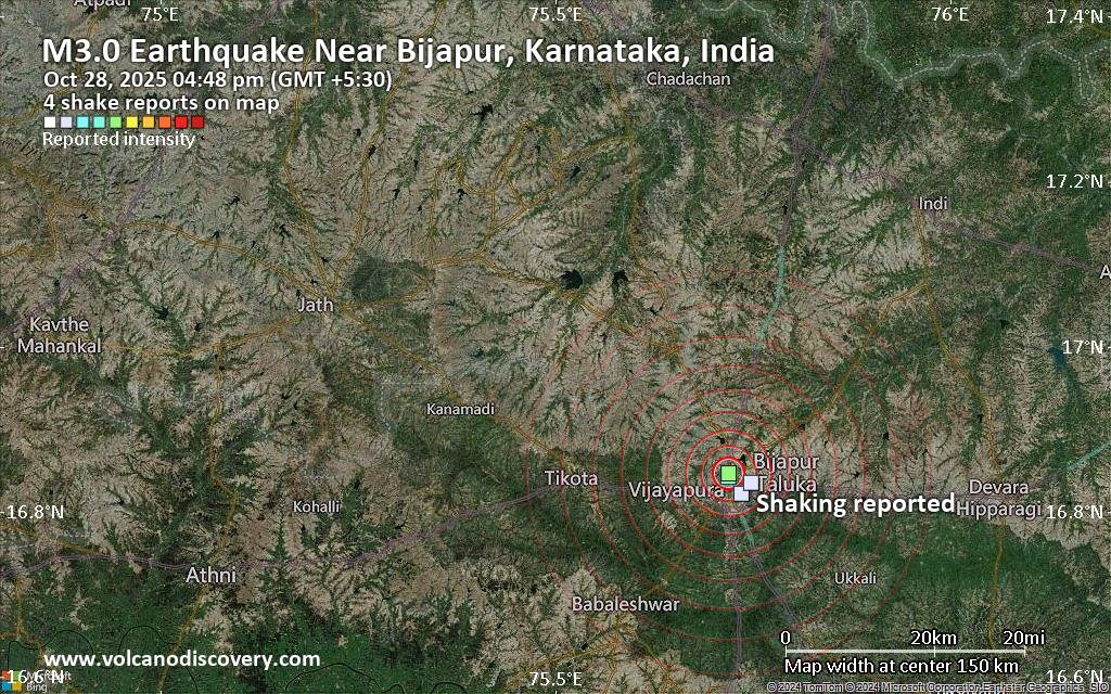Earthquake data: Date & time: Oct 28, 2025 04:48 pm (GMT +5:30) local time (28 Oct 2025 11:18 GMT)Magnitude: unspecified Depth: unspecified Epicenter latitude / longitude: 16.85°N / 75.72°E  ( State of Karnataka, India) Primary data source: VolcanoDiscoveryhttps://www.volcanodiscovery.com/earthquake/news/285077/Seismic-like-event-possible-earthquake-reported-few-minutes-ago-near-Bijapur-Karnataka-India.html