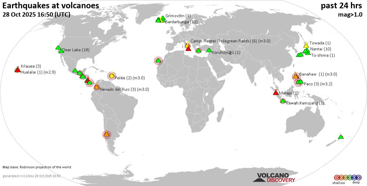 Volcano earthquake report for Tuesday, 28 Oct 2025 World map showing volcanoes with shallow (less than 50 km) earthquakes within 20 km radius during the past 24 hours on 28 Oct 2025 Number in brackets indicate nr of quakes. Quakes detected near: Akita-Komagatake (1 quake mag 1.0), Banahaw (1 quake mag 3.0), Bardarbunga (12 quakes between mag 0.0-1.8), Baru (1 quake mag 3.0), Brennisteinsfjöll (3 quakes between mag 0.6-2.3), Campi Flegrei (Phlegrean Fields) (7 quakes between mag 0.1-3.0) Cerro Singüil (1 quake mag 2.1), Clear Lake (26 quakes between mag 0.2-2.0), Coso (7 quakes between mag 0.8-1.9), Cuilapa-Barbarena (1 quake mag 1.6), El Chichón (5 quakes between mag 1.9-2.8), Etna (2 quakes between mag 1.7-2.8), Gran Canaria (1 quake mag 3.0), Grímsvötn (2 quakes between mag 1.2-1.8), Hengill (1 quake mag 3.0), Hualalai (1 quake mag 2.9), Katla (12 quakes between mag 0.1-2.0), Kilauea (5 quakes between mag 1.3-2.1), Kolumbo (2 quakes between mag 2.2-2.2), Komaga-take (1 quake mag 1.2), Koruhüyüğü (1 quake mag 1.2), Kuju (1 quake mag 1.2), Laguna del Maule (1 quake mag 3.0), Ljósufjöll (11 quakes between mag 0.5-1.7), Marapi (1 quake mag 1.8), Nevado del Ruiz (2 quakes between mag 2.2-3.0), Ontake-san (2 quakes between mag 0.2-1.7), Paco (3 quakes between mag 2.1-3.2), Pelée (5 quakes between mag 0.7-3.0), Platanar (11 quakes between mag 1.5-3.4), Poas (1 quake mag 1.2), Reporoa (1 quake mag 1.9), San Pablo (5 quakes between mag 1.5-3.5), Taal (1 quake mag 3.0), Tenorio (2 quakes between mag 1.2-1.9), Tjörnes Fracture Zone (2 quakes between mag 0.4-1.0), To-shima (1 quake mag 1.3), Torfajökull (4 quakes between mag 0.7-1.1), Towada (1 quake mag 1.0), Yake-dake (5 quakes between mag 0.4-1.0), Öraefajökull (3 quakes between mag 0.1-1.1) (updated 10h50) Note: Earthquakes within 20 km from and at depths less than 50 km under active volcanoes are reported. The list is not complete because many volcanoes are not monitored and/or seismic data in high resolution is not available publicly.