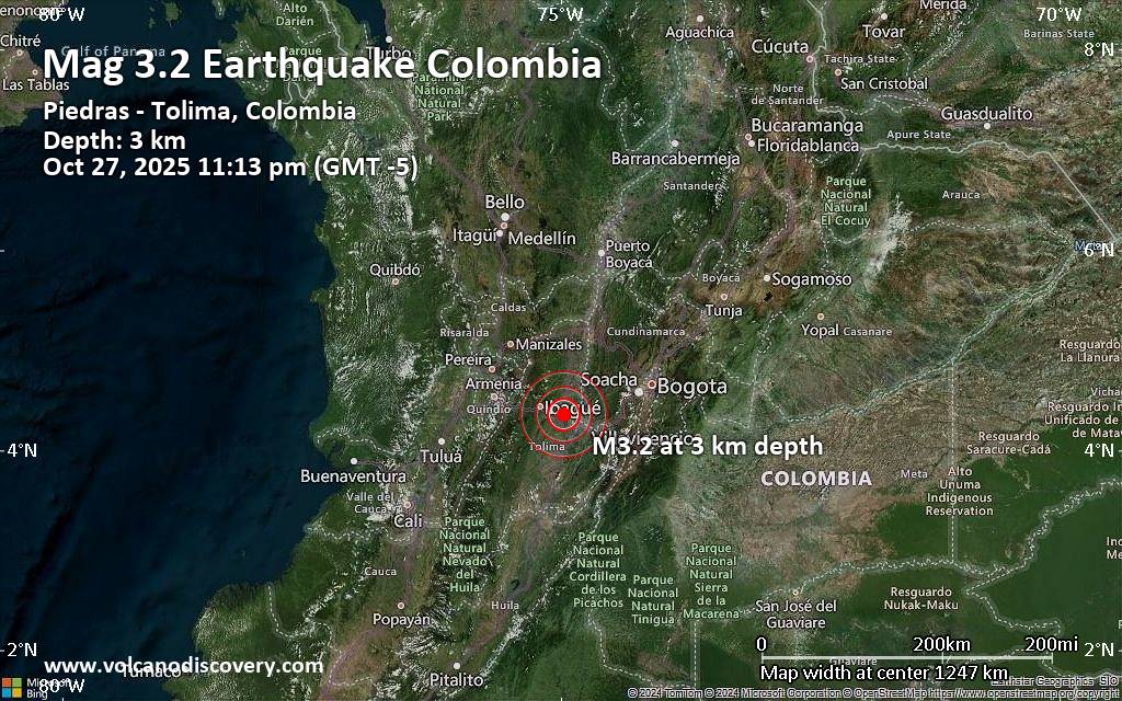 Earthquake data: Date & time: Oct 27, 2025 11:13 pm (GMT -5) local time (28 Oct 2025 04:13 GMT)Magnitude: 3.2 Depth: 3.00 km Epicenter latitude / longitude: 4.36°N / 74.97°W  ( Coello, Departamento de Tolima, Colombia) Primary data source: SGChttps://www.volcanodiscovery.com/earthquake/news/285052/Small-magnitude-32-earthquake-30-km-southeast-of-Ibague-Colombia.html
