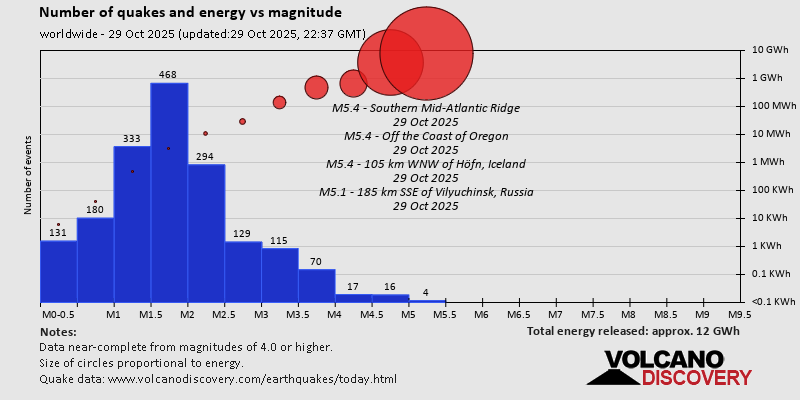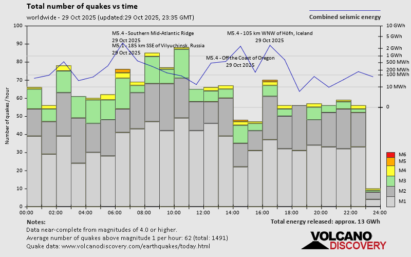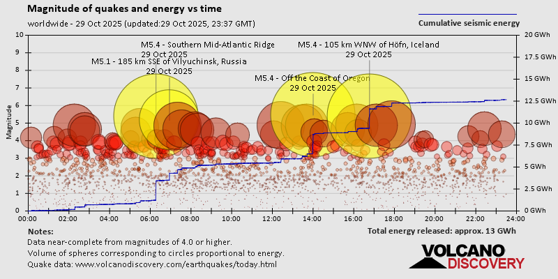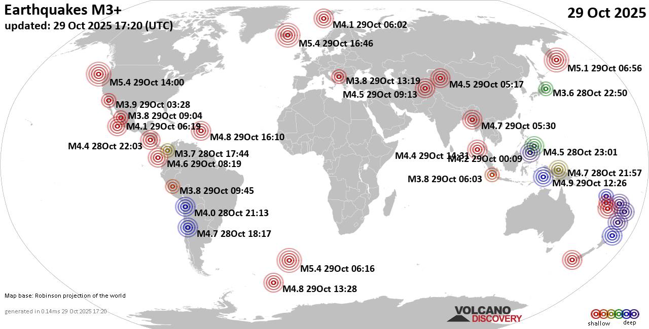 World Earthquake Report for Wednesday, 29 October 2025 Worldwide earthquakes above magnitude 3 during the past 24 hours on 29 Oct 2025 Summary: 4 quakes 5.0+, 36 quakes 4.0+, 209 quakes 3.0+, 465 quakes 2.0+ (714 total)This report is being updated every hour.Magnitude 5+: 4 earthquakes Magnitude 4+: 36 earthquakes Magnitude 3+: 209 earthquakes Magnitude 2+: 465 earthquakes No quakes of magnitude 6 or higher 10 largest earthquakes in the world (past 24 hours)Wednesday, Oct 29, 2025, at 04:46 pm (Universal Time) - Wednesday, Oct 29, 2025, at 05:00 am (GMT -9) - Wednesday, Oct 29, 2025, at 05:16 am (GMT -1) - Wednesday, Oct 29, 2025, at 05:56 pm (GMT +11) - Wednesday, Oct 29, 2025, at 09:26 pm (GMT +9) - Wednesday, Oct 29, 2025, at 08:20 pm (GMT +13) - Thursday, Oct 30, 2025, at 05:08 am (GMT +12) - Wednesday, Oct 29, 2025, at 12:10 pm (GMT -4) - Wednesday, Oct 29, 2025, at 11:28 am (GMT -2) - Wednesday, Oct 29, 2025, at 04:42 am (GMT -9) - Earthquakes reported feltTuesday, Oct 28, 2025, at 10:11 pm (Chicago time) - Wednesday, Oct 29, 2025, at 05:00 am (GMT -9) - #3: Mag 3.8 Montenegro - 10 reportsWednesday, Oct 29, 2025, at 02:19 pm (Podgorica time) - Wednesday, Oct 29, 2025, at 08:38 am (Athens time) - Tuesday, Oct 28, 2025, at 10:19 pm (Athens time) - Wednesday, Oct 29, 2025, at 10:23 am (Vienna time) - Tuesday, Oct 28, 2025, at 04:03 pm (GMT -6) - Tuesday, Oct 28, 2025, at 07:56 pm (Mexico City time) - Wednesday, Oct 29, 2025, at 04:51 am (GMT -4) - Wednesday, Oct 29, 2025, at 12:49 pm (Tirane time) - Wednesday, Oct 29, 2025, at 02:14 pm (Brisbane time) - Tuesday, Oct 28, 2025, at 10:46 pm (Chicago time) - Tuesday, Oct 28, 2025, at 07:07 pm (GMT +1) - Wednesday, Oct 29, 2025, at 07:01 am (GMT +8) - Tuesday, Oct 28, 2025, at 08:34 pm (Santo Domingo time) - Tuesday, Oct 28, 2025, at 02:32 pm (GMT -6) - Thursday, Oct 30, 2025, at 12:01 am (GMT +8) - Tuesday, Oct 28, 2025, at 03:17 pm (San Juan time) - Wednesday, Oct 29, 2025, at 10:07 pm (Manila time) - Tuesday, Oct 28, 2025, at 12:55 pm (GMT -6) - Tuesday, Oct 28, 2025, at 10:27 pm (Tijuana time) - Wednesday, Oct 29, 2025, at 12:08 am (Mexico City time) - Wednesday, Oct 29, 2025, at 06:33 pm (Istanbul time) - Earthquake stats  https://www.volcanodiscovery.com/earthquake/news/285179/World-Earthquake-Report-for-Wednesday-29-October-2025.html