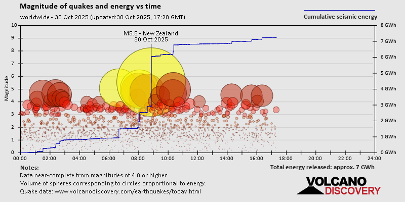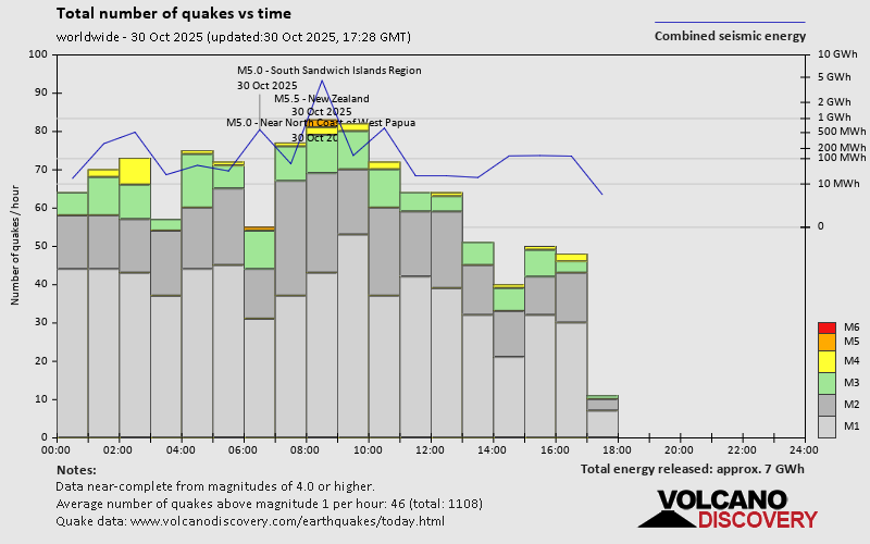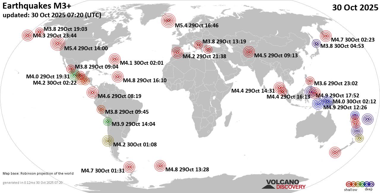World Earthquake Report for Thursday, 30 October 2025 Worldwide earthquakes above magnitude 3 during the past 24 hours on 30 Oct 2025 Summary: 2 quakes 5.0+, 37 quakes 4.0+, 174 quakes 3.0+, 447 quakes 2.0+ (660 total)This report is being updated every hour.Magnitude 5+: 2 earthquakes Magnitude 4+: 37 earthquakes Magnitude 3+: 174 earthquakes Magnitude 2+: 447 earthquakes No quakes of magnitude 6 or higher 10 largest earthquakes in the world (past 24 hours)Wednesday, Oct 29, 2025, at 04:46 pm (Universal Time) - Wednesday, Oct 29, 2025, at 05:00 am (GMT -9) - Thursday, Oct 30, 2025, at 01:52 am (GMT +8) - Wednesday, Oct 29, 2025, at 09:26 pm (GMT +9) - Wednesday, Oct 29, 2025, at 08:20 pm (GMT +13) - Thursday, Oct 30, 2025, at 05:07 am (Fiji time) - Wednesday, Oct 29, 2025, at 12:10 pm (GMT -4) - Wednesday, Oct 29, 2025, at 11:28 am (GMT -2) - Wednesday, Oct 29, 2025, at 04:42 am (GMT -9) - Thursday, Oct 30, 2025, at 01:23 pm (GMT +11) - Earthquakes reported feltWednesday, Oct 29, 2025, at 10:38 pm (Madrid time) - Thursday, Oct 30, 2025, at 01:19 am (Canary time) - Wednesday, Oct 29, 2025, at 11:06 pm (Athens time) - Wednesday, Oct 29, 2025, at 05:00 am (GMT -9) - Wednesday, Oct 29, 2025, at 02:19 pm (Podgorica time) - Wednesday, Oct 29, 2025, at 10:23 am (Vienna time) - Wednesday, Oct 29, 2025, at 04:51 am (GMT -4) - Wednesday, Oct 29, 2025, at 12:49 pm (Tirane time) - Thursday, Oct 30, 2025, at 01:50 am (Canary time) - Wednesday, Oct 29, 2025, at 04:46 pm (Universal Time) - Thursday, Oct 30, 2025, at 12:01 am (Manila time) - Thursday, Oct 30, 2025, at 05:06 am (GMT +9) - Wednesday, Oct 29, 2025, at 06:46 pm (Boise time) - Wednesday, Oct 29, 2025, at 08:21 pm (GMT +8) - Wednesday, Oct 29, 2025, at 06:33 pm (Istanbul time) - Wednesday, Oct 29, 2025, at 10:07 pm (Manila time) - Wednesday, Oct 29, 2025, at 08:04 am (GMT -4) - Earthquake stats  https://www.volcanodiscovery.com/earthquake/news/285366/World-Earthquake-Report-for-Thursday-30-October-2025.html
