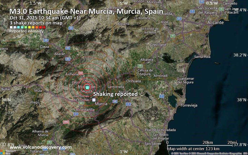 Date & time: Oct 31, 2025 10:34 am (GMT +1) local time (31 Oct 2025 09:34 GMT) Magnitude: unspecified Depth: unspecified Epicenter latitude / longitude: 38.06°N / 1.21°W     (Murcia , Spain ) Primary data source: VolcanoDiscoveryhttps://www.volcanodiscovery.com/earthquake/news/285613/Seismic-like-event-possible-earthquake-reported-few-minutes-ago-near-Murcia-Murcia-Spain.html |  |