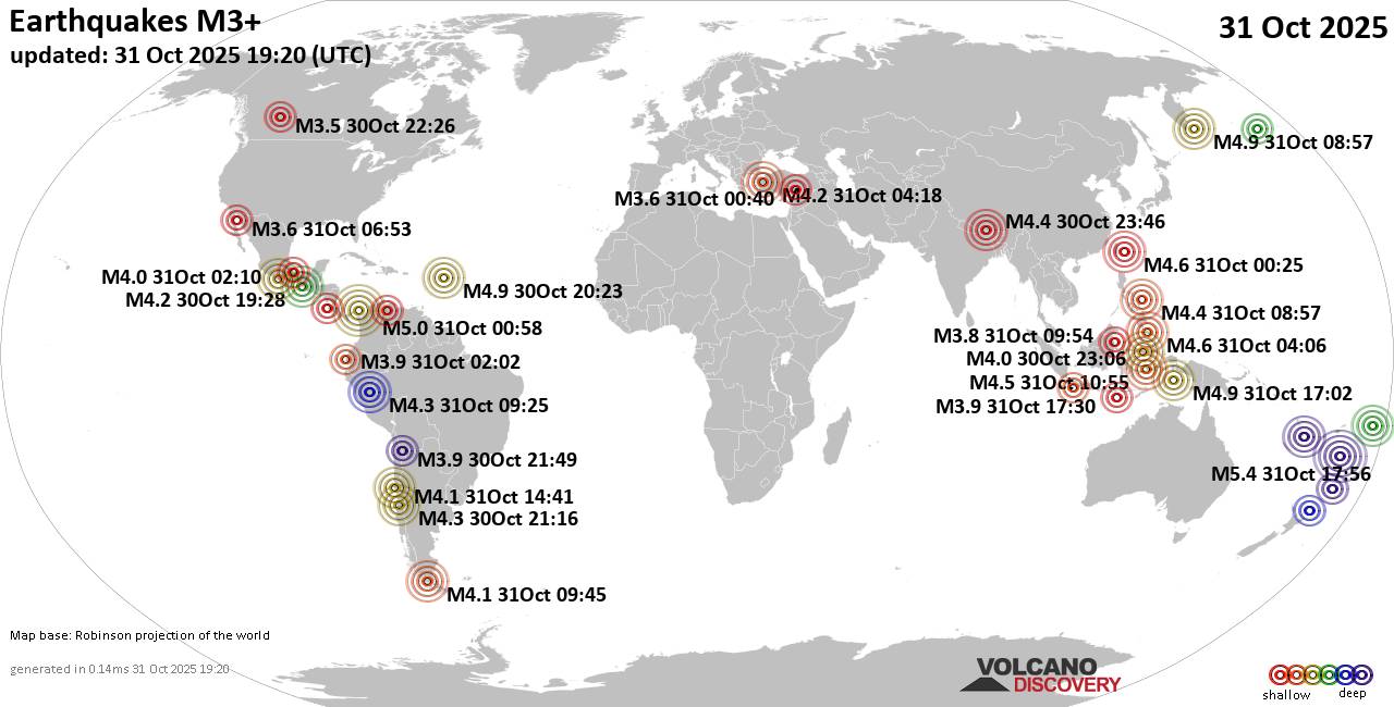 World Earthquake Report for Friday, 31 October 2025 Worldwide earthquakes above magnitude 3 during the past 24 hours on 31 Oct 2025 Summary: 2 quakes 5.0+, 39 quakes 4.0+, 155 quakes 3.0+, 369 quakes 2.0+ (565 total)This report is being updated every hour.Magnitude 5+: 2 earthquakes Magnitude 4+: 39 earthquakes Magnitude 3+: 155 earthquakes Magnitude 2+: 369 earthquakes No quakes of magnitude 6 or higher 10 largest earthquakes in the world (past 24 hours)Saturday, Nov 1, 2025, at 05:56 am (GMT +12) - Thursday, Oct 30, 2025, at 07:58 pm (GMT -5) - Saturday, Nov 1, 2025, at 02:02 am (GMT +9) - Thursday, Oct 30, 2025, at 04:23 pm (GMT -4) - Friday, Oct 31, 2025, at 07:57 pm (GMT +11) - Saturday, Nov 1, 2025, at 04:35 am (Kamchatka time) - Friday, Oct 31, 2025, at 08:04 am (GMT -5) - Friday, Oct 31, 2025, at 05:04 pm (GMT +13) - Friday, Oct 31, 2025, at 05:20 pm (GMT +11) - Friday, Oct 31, 2025, at 12:06 pm (GMT +8) - Earthquakes reported feltFriday, Oct 31, 2025, at 01:55 am (Berlin time) - Friday, Oct 31, 2025, at 10:34 am (Madrid time) - Thursday, Oct 30, 2025, at 06:16 pm (Santiago time) - Friday, Oct 31, 2025, at 12:32 pm (Madrid time) - Friday, Oct 31, 2025, at 08:31 pm (Auckland time) - Thursday, Oct 30, 2025, at 11:52 pm (Istanbul time) - Friday, Oct 31, 2025, at 12:13 am (Caracas time) - Friday, Oct 31, 2025, at 07:18 am (Istanbul time) - Thursday, Oct 30, 2025, at 11:12 pm (Canary time) - Friday, Oct 31, 2025, at 11:57 pm (Manila time) - Friday, Oct 31, 2025, at 03:48 am (Chicago time) - Thursday, Oct 30, 2025, at 01:21 pm (El Salvador time) - Thursday, Oct 30, 2025, at 09:02 pm (Guayaquil time) - Friday, Oct 31, 2025, at 03:40 am (Istanbul time) - Friday, Oct 31, 2025, at 03:30 am (Rome time) - Friday, Oct 31, 2025, at 05:04 am (Istanbul time) - Friday, Oct 31, 2025, at 01:05 am (Guatemala time) - Earthquake stats  https://www.volcanodiscovery.com/earthquake/news/285572/World-Earthquake-Report-for-Friday-31-October-2025.html