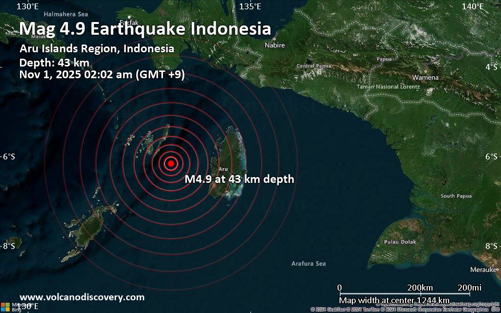 Earthquake data: Date & time: Nov 1, 2025 02:02 am (GMT +9) local time (31 Oct 2025 17:02 GMT)Magnitude: 4.9 Depth: 43.00 km Epicenter latitude / longitude: 6.16°S / 133.21°E  ( Maluku, Indonesia) Primary data source: BMKGhttps://www.volcanodiscovery.com/earthquake/news/285683/Moderate-magnitude-49-quake-hits-78-km-southeast-of-Tual-Indonesia-early-morning-.html