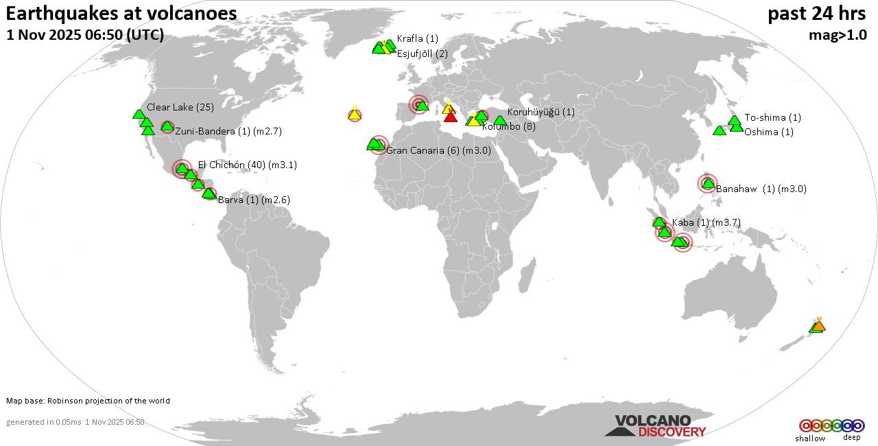 Volcano earthquake report for Saturday, 1 Nov 2025 World map showing volcanoes with shallow (less than 50 km) earthquakes within 20 km radius during the past 24 hours on 1 Nov 2025 Number in brackets indicate nr of quakes. Quakes detected near: Arenal (1 quake mag 2.2), Banahaw (1 quake mag 3.0), Barva (1 quake mag 2.6), Biliran (1 quake mag 1.7), Campi Flegrei (Phlegrean Fields) (22 quakes between mag 0.1-2.0), Cerro Negro de Mayasquer (1 quake mag 1.9) Clear Lake (23 quakes between mag 0.2-2.1), Coso (3 quakes between mag 0.9-1.0), Dieng (1 quake mag 3.2), El Chichón (24 quakes between mag 1.7-3.1), Esjufjöll (2 quakes between mag 0.9-1.2), Etna (1 quake mag 1.0), Gran Canaria (10 quakes between mag 0.2-3.0), Hofsjökull (2 quakes between mag 1.9-2.5), Katla (2 quakes between mag 1.5-2.1), Kolumbo (5 quakes between mag 0.8-1.2), Koruhüyüğü (1 quake mag 1.5), Krafla (1 quake mag 1.0), Krísuvík (10 quakes between mag 0.2-2.0), Kula (1 quake mag 2.3), Ljósufjöll (1 quake mag 1.5), Loki-Fögrufjöll volcano (1 quake mag 1.6), Milos (1 quake mag 2.8), Nantai (7 quakes between mag 0.3-1.0), Nisyros (1 quake mag 3.4), Okataina (Tarawera) (6 quakes between mag 1.6-3.3), Olot Field (1 quake mag 3.0), Oshima (1 quake mag 1.4), Platanar (1 quake mag 1.6), Reporoa (1 quake mag 1.6), Salton Buttes (3 quakes between mag 1.1-1.7), Santa Clara (1 quake mag 3.0), Santorini (2 quakes between mag 0.7-1.4), Sarik-Gajah (3 quakes between mag 2.6-3.3), Tenerife (2 quakes between mag 0.7-1.1), Tenorio (1 quake mag 1.9), Terceira (2 quakes between mag 2.1-2.3), To-shima (1 quake mag 1.7), Vesuvius (5 quakes between mag 0.1-1.2), Washiba-Kumonotaira (2 quakes between mag 0.1-1.7), White Island (2 quakes between mag 1.8-2.0) (updated 01h50) Note: Earthquakes within 20 km from and at depths less than 50 km under active volcanoes are reported. The list is not complete because many volcanoes are not monitored and/or seismic data in high resolution is not available publicly.