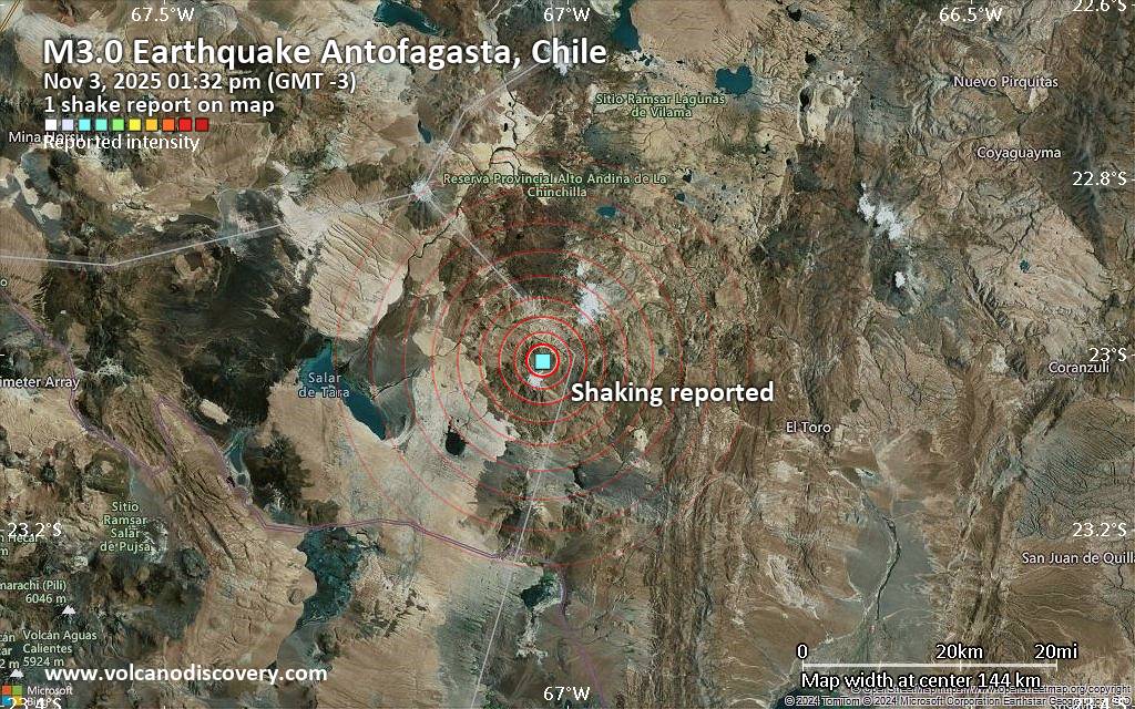 Earthquake data:      Date & time: Nov 3, 2025 01:32 pm (GMT -3) local time  (3 Nov 2025 16:32 GMT)Magnitude: unspecified Depth: unspecified Epicenter latitude / longitude: 23.01°S / 67.03°W     ( Argentina) Primary data source:  VolcanoDiscoveryhttps://www.volcanodiscovery.com/earthquake/news/285882/Seismic-like-event-possible-earthquake-reported-few-minutes-ago-Antofagasta-Chile.html