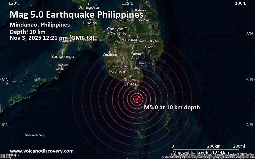 Earthquake data:      Date & time: Nov 3, 2025 12:21 pm (GMT +8) local time  (3 Nov 2025 04:21 GMT)Magnitude: 5.0 Depth: 10.00 km Epicenter latitude / longitude: 5.13°N / 125.41°E     (Davao Occidental,  Davao,  Philippines) Primary data source:  BMKGhttps://www.volcanodiscovery.com/earthquake/news/285846/Magnitude-50-earthquake-strikes-near-Glan-Province-of-Sarangani-Soccsksargen-Philippines.html