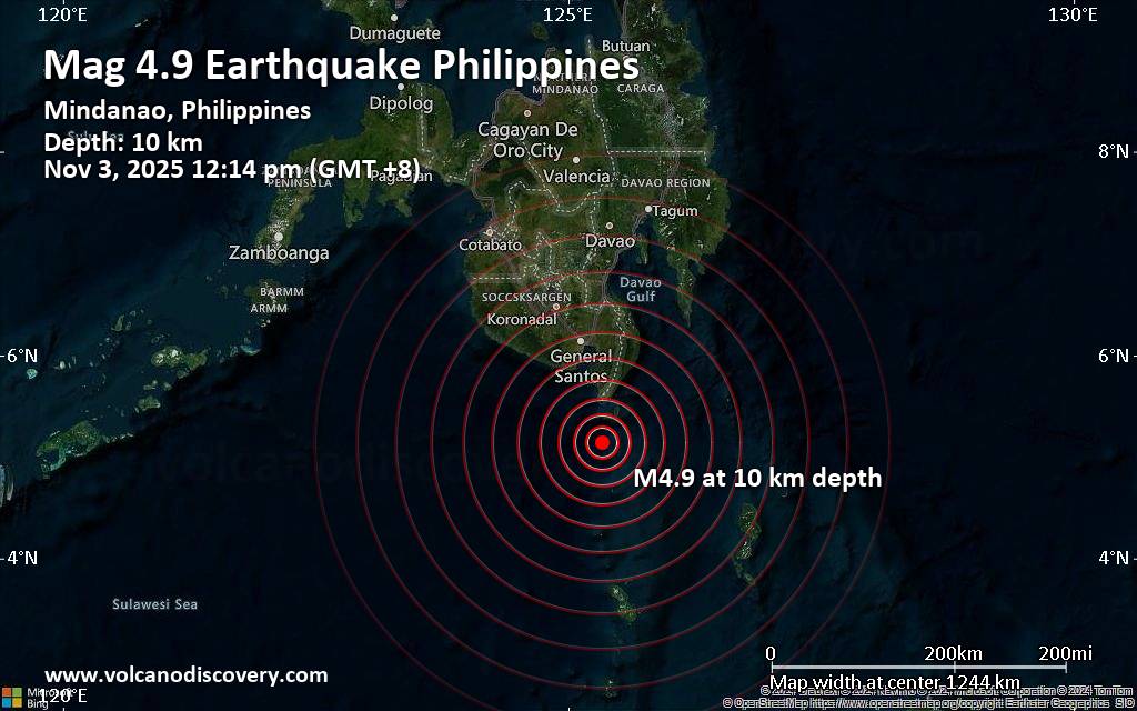 Moderate earthquake of magnitude 4.9 just reported 77 km south of Glan, Philippines An earthquake of magnitude 4.9 occurred around noon on Monday, November 3rd, 2025, at 12:14 pm local time near Glan, Province of Sarangani, Soccsksargen, Philippines, as reported by Indonesia's Meteorology, Climatology, and Geophysical Agency. According to preliminary data, the quake was located at a shallow depth of 10. km. Shallow earthquakes are felt more strongly than deeper ones as they are closer to the surface. The exact magnitude, epicenter, and depth of the quake might be revised within the next few hours or minutes as seismologists review data and refine their calculations, or as other agencies issue their report. A second report was later issued by the citizen-seismograph network of RaspberryShake, which listed it as a magnitude 4.9 earthquake as well. Based on the preliminary seismic data, the quake was probably felt by many people in the area of the epicenter. It should not have caused significant damage, other than objects falling from shelves, broken windows, etc.  In Sarangani (pop. 7,500) located 33 km from the epicenter, the quake should have been felt as light shaking. Weak shaking might have been felt in Balangonan (pop. 2,300) located 48 km from the epicenter, Bukid (pop. 2,200) 49 km away, Glan (pop. 24,300) 77 km away, Sapu Padidu (pop. 9,800) 87 km away, Sapu Padidu (pop. 9,800) 87 km away, Malapatan (pop. 19,400) 92 km away, and Caburan (pop. 12,600) 93 km away. Other towns or cities near the epicenter where the quake might have been felt as very weak shaking include General Santos (pop. 697,300) located 110 km from the epicenter. VolcanoDiscovery will automatically update magnitude and depth if these change and follow up if other significant news about the quake become available. If you’re in the area, please send us your experience through our reporting mechanism, either online or via our mobile app. This will help us provide more first-hand updates to anyone around the globe who wants to know more about this quake.