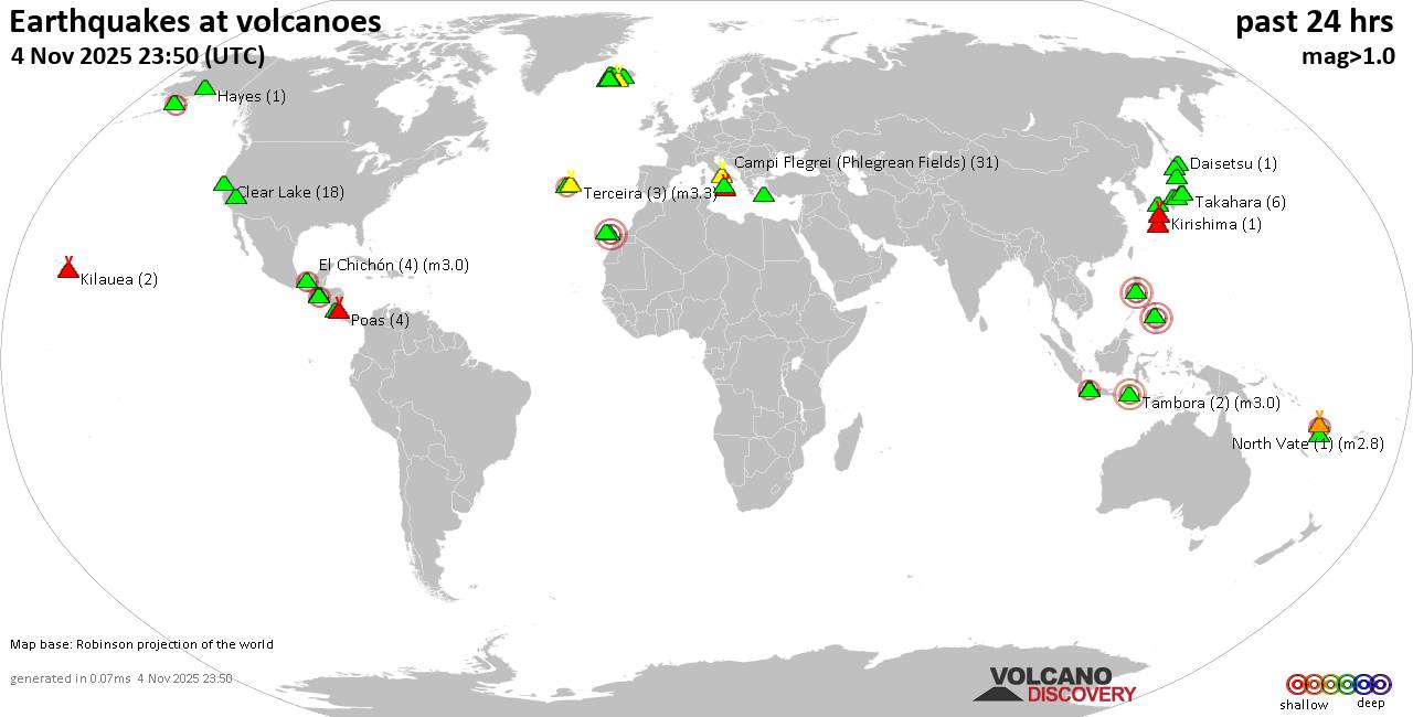 Volcano earthquake report for Tuesday, 4 Nov 2025 World map showing volcanoes with shallow (less than 50 km) earthquakes within 20 km radius during the past 24 hours on 4 Nov 2025 Number in brackets indicate nr of quakes. Quakes detected near: Abu (2 quakes between mag 0.8-1.2), Aoba (1 quake mag 2.0), Apaneca Range (60 quakes between mag 1.5-3.2), Brennisteinsfjöll (3 quakes between mag 0.8-1.5), Campi Flegrei (Phlegrean Fields) (30 quakes between mag 0.1-2.4), Cerro Singüil (1 quake mag 2.4) Clear Lake (16 quakes between mag 0.6-1.9), Coso (4 quakes between mag 1.0-1.3), Daisetsu (1 quake mag 1.3), El Chichón (4 quakes between mag 2.3-3.0), Eldey (4 quakes between mag 1.1-2.6), Etna (2 quakes between mag 1.1-1.2), Gran Canaria (5 quakes between mag 0.4-3.0), Haku-san (2 quakes between mag 0.6-1.0), Hayes (1 quake mag 1.1), Hekla (3 quakes between mag 0.1-1.1), Hofsjökull (1 quake mag 1.4), Hrómundartindur (1 quake mag 1.0), Iwaki (2 quakes between mag 0.7-1.4), Izalco (3 quakes between mag 2.2-2.6), Katla (2 quakes between mag 1.0-1.2), Kawah Kamojang (1 quake mag 2.3), Kilauea (2 quakes between mag 1.2-1.8), Kirishima (1 quake mag 1.1), Kolumbo (11 quakes between mag 0.7-2.9), Krísuvík (7 quakes between mag 0.2-1.2), Laacher See (1 quake mag 3.0), Lipari (2 quakes between mag 1.9-2.2), Ljósufjöll (8 quakes between mag 0.4-1.2), Loki-Fögrufjöll volcano (1 quake mag 1.7), Nantai (5 quakes between mag 0.1-1.3), Natib (1 quake mag 3.0), Nikko-Shirane (4 quakes between mag 0.1-1.2), North Vate (1 quake mag 2.8), Ontake-san (2 quakes between mag 0.2-1.2), Papandayan (2 quakes between mag 1.6-2.1), Pico (1 quake mag 2.2), Poas (4 quakes between mag 0.7-1.0), Prestahnukur (1 quake mag 1.6), Shikotsu (1 quake mag 1.0), Suwanose-jima (2 quakes between mag 1.7-2.2), Takahara (4 quakes between mag 0.1-1.0), Tambora (2 quakes between mag 2.7-3.0), Tenerife (2 quakes between mag 0.7-1.0), Tenorio (5 quakes between mag 1.4-2.3), Terceira (3 quakes between mag 2.2-3.3), Ugashik-Peulik (2 quakes between mag 1.9-2.2) (updated 22h50) Note: Earthquakes within 20 km from and at depths less than 50 km under active volcanoes are reported. The list is not complete because many volcanoes are not monitored and/or seismic data in high resolution is not available publicly.
