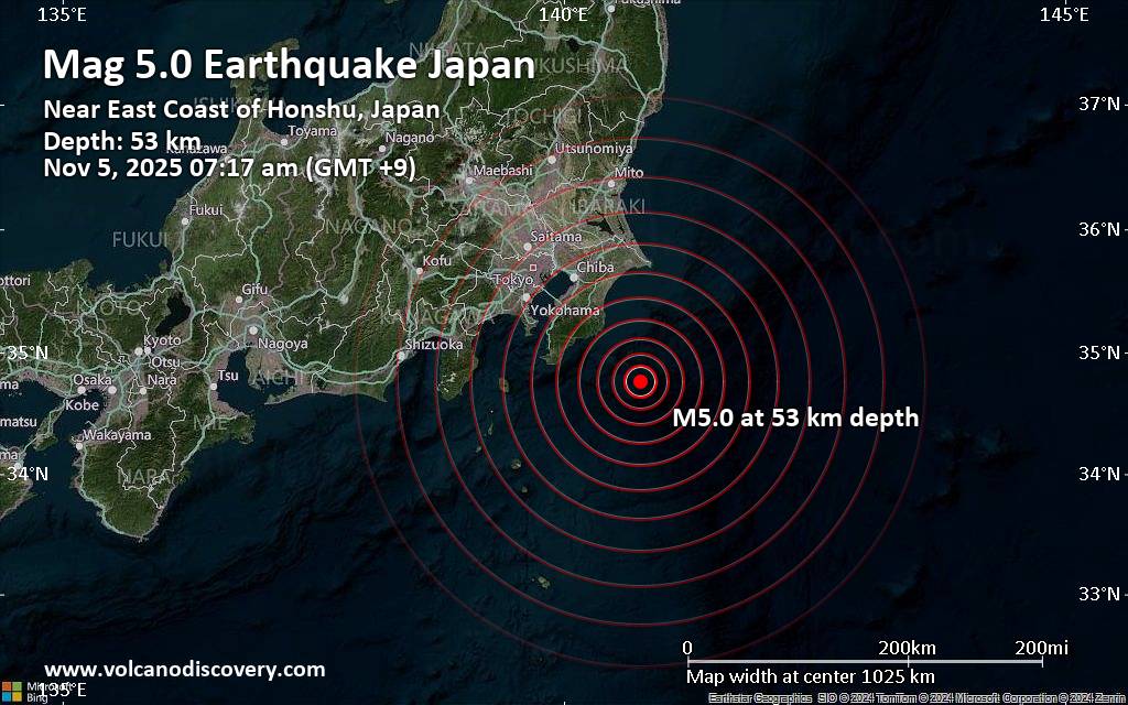 Earthquake data: Date & time: Nov 5, 2025 07:17 am (GMT +9) local time (4 Nov 2025 22:17 GMT)Magnitude: 5.0 Depth: 53.00 km Epicenter latitude / longitude: 34.76°N / 140.76°E  ( Chiba, Japan) Primary data source: EMSChttps://www.volcanodiscovery.com/earthquake/news/285959/Significant-magnitude-50-quake-hits-86-km-southeast-of-Mobara-Japan-in-the-morning-.html