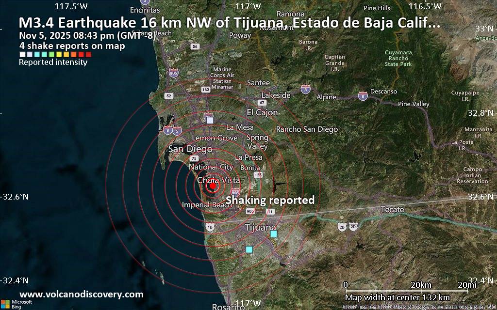 Earthquake data: Date & time: Nov 5, 2025 08:43 pm (GMT -8) local time (6 Nov 2025 04:43 GMT)Magnitude: unspecified Depth: unspecified Epicenter latitude / longitude: 32.63°N / 117.1°W  (Playas de Rosarito, Mexico) Primary data source: VolcanoDiscoveryhttps://www.volcanodiscovery.com/earthquake/news/286202/Seismic-like-event-possible-earthquake-reported-few-minutes-ago-near-Tijuana-Baja-California-Mexico.html