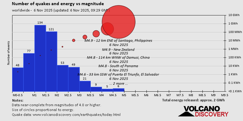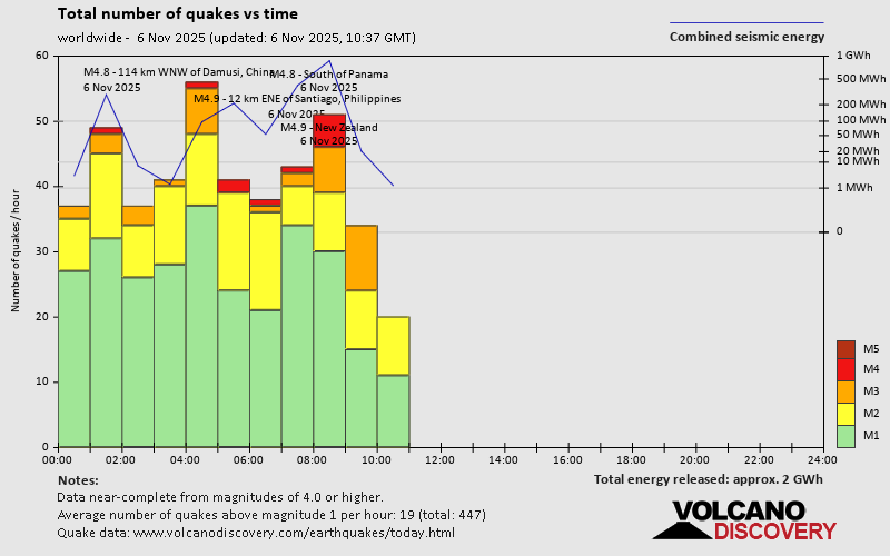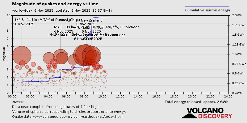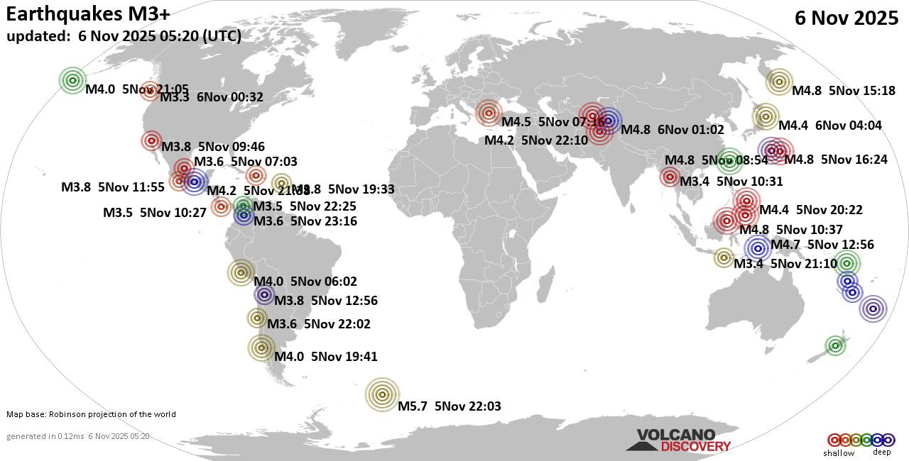 World Earthquake Report for Thursday, 6 November 2025 Worldwide earthquakes above magnitude 3 during the past 24 hours on 6 Nov 2025 Summary: 1 quake 5.0+, 35 quakes 4.0+, 122 quakes 3.0+, 339 quakes 2.0+ (497 total)This report is being updated every hour.Magnitude 5+: 1 earthquake Magnitude 4+: 35 earthquakes Magnitude 3+: 122 earthquakes Magnitude 2+: 339 earthquakes No quakes of magnitude 6 or higher 10 largest earthquakes in the world (past 24 hours)Wednesday, Nov 5, 2025, at 08:03 pm (GMT -2) - Thursday, Nov 6, 2025, at 09:02 am (Urumqi time) - Thursday, Nov 6, 2025, at 03:18 am (GMT +12) - Thursday, Nov 6, 2025, at 01:24 am (GMT +9) - Wednesday, Nov 5, 2025, at 06:37 pm (Makassar time) - Wednesday, Nov 5, 2025, at 05:54 pm (GMT +9) - Thursday, Nov 6, 2025, at 04:48 am (GMT +11) - Wednesday, Nov 5, 2025, at 09:56 pm (GMT +9) - Wednesday, Nov 5, 2025, at 06:05 pm (GMT +9) - Thursday, Nov 6, 2025, at 09:02 am (GMT +11) - Earthquakes reported feltWednesday, Nov 5, 2025, at 09:16 am (Athens time) - #2: Mag 4.8 Borneo - 10 reportsWednesday, Nov 5, 2025, at 06:37 pm (Makassar time) - Wednesday, Nov 5, 2025, at 10:58 am (Dushanbe time) - Wednesday, Nov 5, 2025, at 04:41 pm (Santiago time) - Wednesday, Nov 5, 2025, at 03:32 am (Santo Domingo time) - Wednesday, Nov 5, 2025, at 09:47 pm (Manila time) - Wednesday, Nov 5, 2025, at 08:26 pm (Madrid time) - Thursday, Nov 6, 2025, at 04:22 am (GMT +8) - Wednesday, Nov 5, 2025, at 07:12 am (Los Angeles time) - Wednesday, Nov 5, 2025, at 06:16 pm (Bogota time) - Wednesday, Nov 5, 2025, at 09:35 am (GMT +3) - Wednesday, Nov 5, 2025, at 10:20 am (GMT +3) - Wednesday, Nov 5, 2025, at 08:44 am (GMT -8) - Earthquake stats  https://www.volcanodiscovery.com/earthquake/news/286204/World-Earthquake-Report-for-Thursday-6-November-2025.html