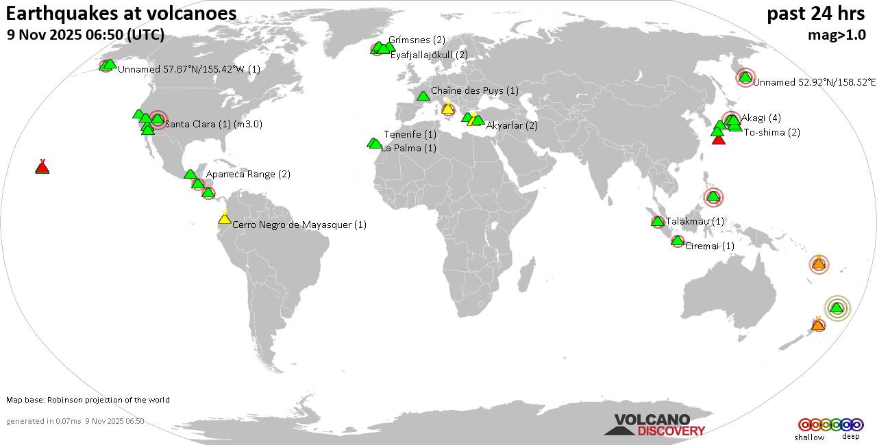 Volcano earthquake report for Sunday, 9 Nov 2025 World map showing volcanoes with shallow (less than 50 km) earthquakes within 20 km radius during the past 24 hours on 9 Nov 2025 Number in brackets indicate nr of quakes. Quakes detected near: Akagi (4 quakes between mag 0.8-1.1), Akyarlar (2 quakes between mag 1.6-2.1), Aoba (1 quake mag 3.5), Apaneca Range (4 quakes between mag 1.8-2.2), Bardarbunga (1 quake mag 3.2), Barva (1 quake mag 2.5) Brennisteinsfjöll (1 quake mag 1.1), Campi Flegrei (Phlegrean Fields) (28 quakes between mag 0.1-1.1), Cerro Negro de Mayasquer (1 quake mag 1.0), Chaîne des Puys (1 quake mag 1.9), Churchill (1 quake mag 1.4), Clear Lake (17 quakes between mag 0.2-2.1), Cleveland (1 quake mag 1.0), Cuernos de Negros (1 quake mag 3.0), El Chichón (4 quakes between mag 1.9-2.8), Eldey (4 quakes between mag 1.6-1.9), Eyafjallajökull (2 quakes between mag 0.4-1.3), Grímsnes (2 quakes between mag 1.1-1.4), Hakone (1 quake mag 1.1), Havre Seamount (1 quake mag 4.0), Hibok-Hibok (1 quake mag 3.0), Katla (5 quakes between mag 0.6-1.5), Kilauea (3 quakes between mag 1.7-2.1), Kolumbo (1 quake mag 1.2), La Palma (1 quake mag 1.2), Ljósufjöll (9 quakes between mag 0.4-1.6), Loihi (2 quakes between mag 1.7-1.8), Loki-Fögrufjöll volcano (1 quake mag 1.2), Machin (1 quake mag 3.0), Mammoth Mountain (1 quake mag 1.5), Maunaloa (3 quakes between mag 1.7-2.2), Miyake-shima (1 quake mag 1.5), Myoko (1 quake mag 3.0), Nantai (8 quakes between mag 0.1-1.3), Prestahnukur (1 quake mag 1.1), Sanbe (4 quakes between mag 0.3-1.0), Santorini (2 quakes between mag 0.8-1.4), Sousaki (1 quake mag 1.5), Suwanose-jima (1 quake mag 1.9), Talakmau (1 quake mag 2.4), Taranaki (1 quake mag 1.4), Tenerife (2 quakes between mag 0.9-1.1), Tenorio (1 quake mag 2.5), Terceira (1 quake mag 2.0), Tjörnes Fracture Zone (1 quake mag 1.2), To-shima (1 quake mag 1.7), Unzen (1 quake mag 1.3), White Island (1 quake mag 2.8), Yake-dake (2 quakes between mag 0.3-1.0) (updated 01h50) Note: Earthquakes within 20 km from and at depths less than 50 km under active volcanoes are reported. The list is not complete because many volcanoes are not monitored and/or seismic data in high resolution is not available publicly.