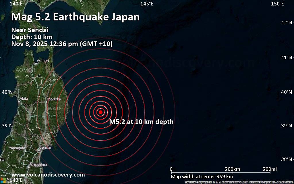 Significant earthquake of magnitude 5.2 just reported 110 km east of Yamada, Japan A shallow magnitude 5.2 earthquake was reported around noon near Yamada, Shimohei-gun, Iwate, Japan. According to France's Réseau National de Surveillance Sismique (RéNaSS), the quake hit on Saturday, November 8th, 2025, at 12:36 pm local time at a shallow depth of 10. km. Shallow earthquakes are felt more strongly than deeper ones as they are closer to the surface. The exact magnitude, epicenter, and depth of the quake might be revised within the next few hours or minutes as seismologists review data and refine their calculations, or as other agencies issue their report. A second report was later issued by Japan's National Research Institute for Earth Science and Disaster Resilience (NIED), which listed it as a magnitude 5.3 earthquake. A third agency, the citizen-seismograph network of RaspberryShake, reported the same quake at magnitude 4.6. Based on the preliminary seismic data, the quake should not have caused any significant damage, but was probably felt by many people as light vibration in the area of the epicenter. Weak shaking might have been felt in Yamada (pop. 15,200) located 110 km from the epicenter, Miyako (pop. 51,200) 114 km away, and Kamaishi (pop. 43,100) 118 km away. VolcanoDiscovery will automatically update magnitude and depth if these change and follow up if other significant news about the quake become available. If you’re in the area, please send us your experience through our reporting mechanism, either online or via our mobile app. This will help us provide more first-hand updates to anyone around the globe who wants to know more about this quake.