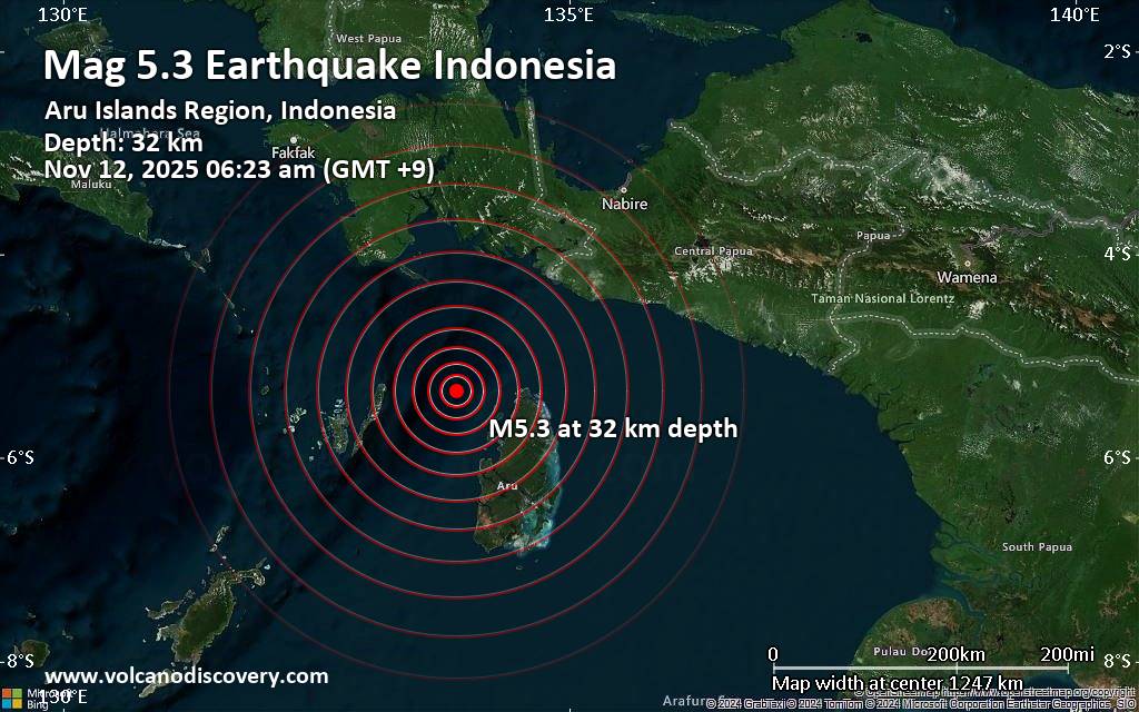 Significant earthquake of magnitude 5.3 just reported 129 km northeast of Tual, Indonesia Indonesia's Meteorology, Climatology, and Geophysical Agency reported a magnitude 5.3 quake in Indonesia near Tual, Kota Tual, Maluku, only 15 minutes ago. The earthquake hit early morning on Wednesday, November 12th, 2025, at 6:23 am local time at a moderately shallow depth of 32. km. The exact magnitude, epicenter, and depth of the quake might be revised within the next few hours or minutes as seismologists review data and refine their calculations, or as other agencies issue their report. Our monitoring service identified a second report from the German Research Centre for Geosciences (GFZ) which listed the quake at magnitude 5.2. Other agencies reporting the same quake include the European-Mediterranean Seismological Centre (EMSC) at magnitude 5.1, and the citizen-seismograph network of RaspberryShake at magnitude 5.2. Generally quakes of this magnitude are recorded by more than one agency and the results can vary, with subsequent reports that come in after the first one often showing more accuracy. Based on the preliminary seismic data, the quake should not have caused any significant damage, but was probably felt by many people as light vibration in the area of the epicenter. Weak shaking might have been felt in Tual (pop. 90,000) located 129 km from the epicenter. VolcanoDiscovery will automatically update magnitude and depth if these change and follow up if other significant news about the quake become available. If you’re in the area, please send us your experience through our reporting mechanism, either online or via our mobile app. This will help us provide more first-hand updates to anyone around the globe who wants to know more about this quake.