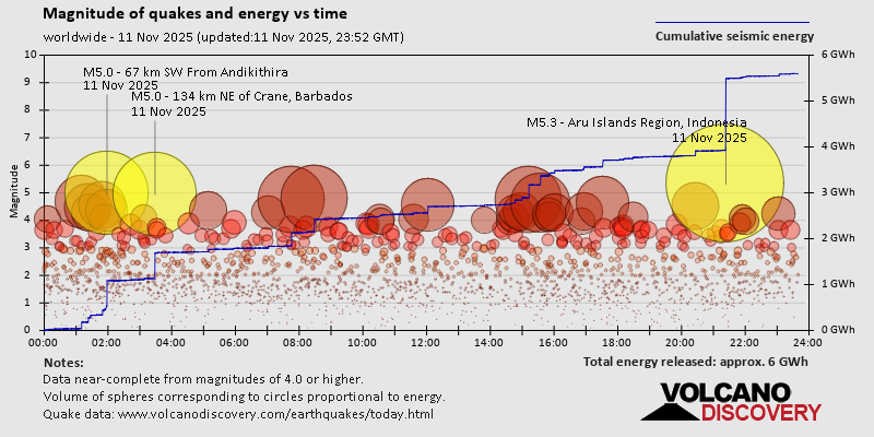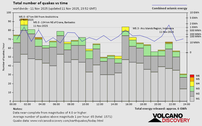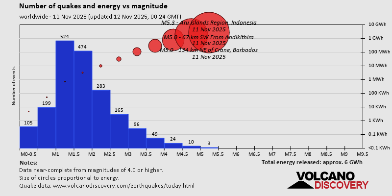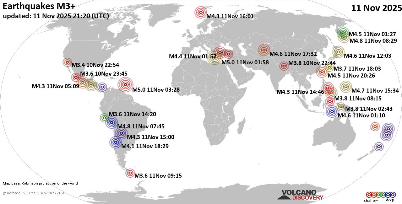 World Earthquake Report for Tuesday, 11 November 2025 Worldwide earthquakes above magnitude 3 during the past 24 hours on 11 Nov 2025 Summary: 2 quakes 5.0+, 33 quakes 4.0+, 150 quakes 3.0+, 436 quakes 2.0+ (621 total)This report is being updated every hour.Magnitude 5+: 2 earthquakes Magnitude 4+: 33 earthquakes Magnitude 3+: 150 earthquakes Magnitude 2+: 436 earthquakes No quakes of magnitude 6 or higher 10 largest earthquakes in the world (past 24 hours)Tuesday, Nov 11, 2025, at 03:58 am (GMT +2) - Tuesday, Nov 11, 2025, at 03:28 am (Universal Time) - Tuesday, Nov 11, 2025, at 02:45 am (GMT -5) - Tuesday, Nov 11, 2025, at 07:29 pm (GMT +11) - Tuesday, Nov 11, 2025, at 03:12 am (GMT -12) - Wednesday, Nov 12, 2025, at 12:34 am (GMT +9) - Tuesday, Nov 11, 2025, at 10:10 am (Jayapura time) - Tuesday, Nov 11, 2025, at 09:03 pm (GMT +9) - Tuesday, Nov 11, 2025, at 10:32 pm (Tashkent time) - Tuesday, Nov 11, 2025, at 10:23 am (GMT +9) - Earthquakes reported feltTuesday, Nov 11, 2025, at 10:32 pm (Tashkent time) - Tuesday, Nov 11, 2025, at 03:58 am (GMT +2) - Monday, Nov 10, 2025, at 11:09 pm (GMT -6) - Tuesday, Nov 11, 2025, at 03:28 am (Universal Time) - Tuesday, Nov 11, 2025, at 10:46 pm (Manila time) - Tuesday, Nov 11, 2025, at 06:08 am (Istanbul time) - Tuesday, Nov 11, 2025, at 11:51 pm (Manila time) - Tuesday, Nov 11, 2025, at 01:27 pm (Kamchatka time) - Monday, Nov 10, 2025, at 08:36 pm (Mexico City time) - Tuesday, Nov 11, 2025, at 01:57 am (Istanbul time) - Tuesday, Nov 11, 2025, at 03:40 am (Istanbul time) - Tuesday, Nov 11, 2025, at 10:29 am (Athens time) - Earthquake stats  https://www.volcanodiscovery.com/earthquake/news/286719/World-Earthquake-Report-for-Tuesday-11-November-2025.html