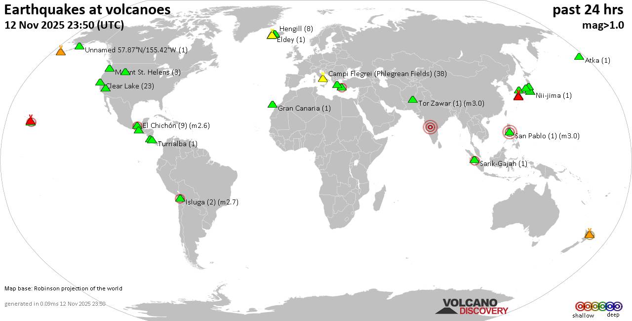 Volcano earthquake report for Wednesday, 12 Nov 2025 World map showing volcanoes with shallow (less than 50 km) earthquakes within 20 km radius during the past 24 hours on 12 Nov 2025 Number in brackets indicate nr of quakes. Quakes detected near: Akagi (4 quakes between mag 0.3-1.2), Askja (14 quakes between mag 0.2-2.2), Atka (1 quake mag 1.0), Campi Flegrei (Phlegrean Fields) (40 quakes between mag 0.1-1.4), Clear Lake (23 quakes between mag 0.2-1.7), Coso (1 quake mag 1.5) El Chichón (9 quakes between mag 1.8-2.6), Eldey (1 quake mag 1.7), Gran Canaria (1 quake mag 1.9), Hakone (2 quakes between mag 0.4-1.4), Hengill (8 quakes between mag 0.2-1.1), Isluga (3 quakes between mag 2.6-2.7), Kilauea (4 quakes between mag 1.7-2.4), Kirishima (4 quakes between mag 0.4-1.3), Kolumbo (3 quakes between mag 1.6-2.1), Krísuvík (6 quakes between mag 0.2-1.0), Las Cumbres (1 quake mag 2.5), Ljósufjöll (9 quakes between mag 0.2-2.6), Loihi (5 quakes between mag 1.7-1.8), Mount St. Helens (3 quakes between mag 0.5-1.0), Nantai (4 quakes between mag 0.1-1.4), Nii-jima (1 quake mag 1.6), Prestahnukur (1 quake mag 1.5), Sakurajima (1 quake mag 1.2), San Pablo (1 quake mag 3.0), Sanbe (4 quakes between mag 0.4-1.2), Sarik-Gajah (1 quake mag 2.0), Shishaldin (4 quakes between mag 1.0-1.3), Sousaki (1 quake mag 1.5), Svartsengi (2 quakes between mag 0.2-1.1), Tacana (1 quake mag 3.0), Tenorio (1 quake mag 1.6), Tor Zawar (1 quake mag 3.0), Turrialba (1 quake mag 1.8), White Island (1 quake mag 2.4), Yake-dake (6 quakes between mag 0.4-2.0), Yellowstone (3 quakes between mag 0.8-1.0) (updated 22h50) Note: Earthquakes within 20 km from and at depths less than 50 km under active volcanoes are reported. The list is not complete because many volcanoes are not monitored and/or seismic data in high resolution is not available publicly.