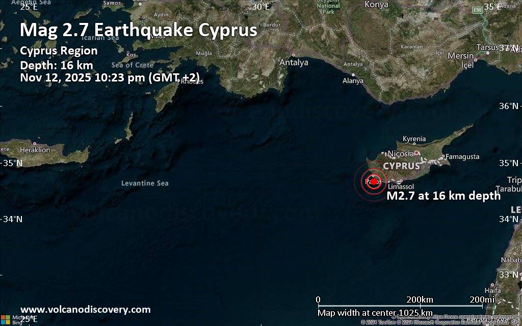 Earthquake data: Date & time: Nov 12, 2025 10:23 pm (Nicosia time) local time (12 Nov 2025 20:23 GMT)Magnitude: 2.7 Depth: 15.60 km Epicenter latitude / longitude: 34.67°N / 32.44°E  ( Pentalia, Pafos, Cyprus) Primary data source: EMSChttps://www.volcanodiscovery.com/earthquake/news/286855/Magnitude-27-earthquake-strikes-near-Paphos-Pafos-Cyprus.html