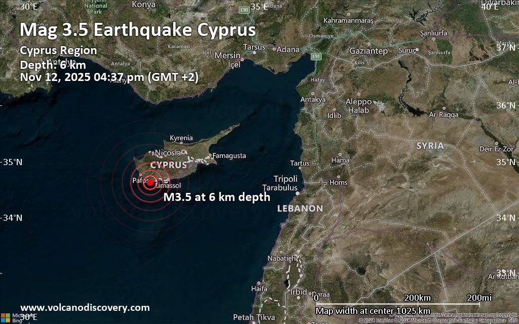 Small magnitude 3.5 quake hits 37 km west of Limassol, Cyprus in the afternoon An earthquake of magnitude 3.5 occurred in the afternoon on Wednesday, November 12th, 2025, at 4:37 pm local time near Limassol, Limassol District, Cyprus, as reported by the European-Mediterranean Seismological Centre (EMSC). According to preliminary data, the quake was located at a very shallow depth of 5.70 km. Shallow earthquakes are felt more strongly than deeper ones as they are closer to the surface. The exact magnitude, epicenter, and depth of the quake might be revised within the next few hours or minutes as seismologists review data and refine their calculations, or as other agencies issue their report. A second report was later issued by the citizen-seismograph network of RaspberryShake, which listed it as a magnitude 3.5 earthquake as well. Based on the preliminary seismic data, the quake should not have caused any significant damage, but was probably felt by many people as light vibration in the area of the epicenter. Weak shaking might have been felt in Pissouri (pop. 1,100) located 7 km from the epicenter. Other towns or cities near the epicenter where the quake might have been felt as very weak shaking include Geroskipou (pop. 8,400) located 22 km from the epicenter, Paphos (pop. 36,000) 25 km away, Kolossi (pop. 6,500) 27 km away, Kato Polemidia (pop. 23,200) 33 km away, Limassol (pop. 154,000) 37 km away, and Germasogeia (pop. 17,300) 42 km away. In Kato Lakatameia (pop. 40,000, 83 km away), and Strovolos (pop. 67,900, 85 km away), the quake was probably not felt.