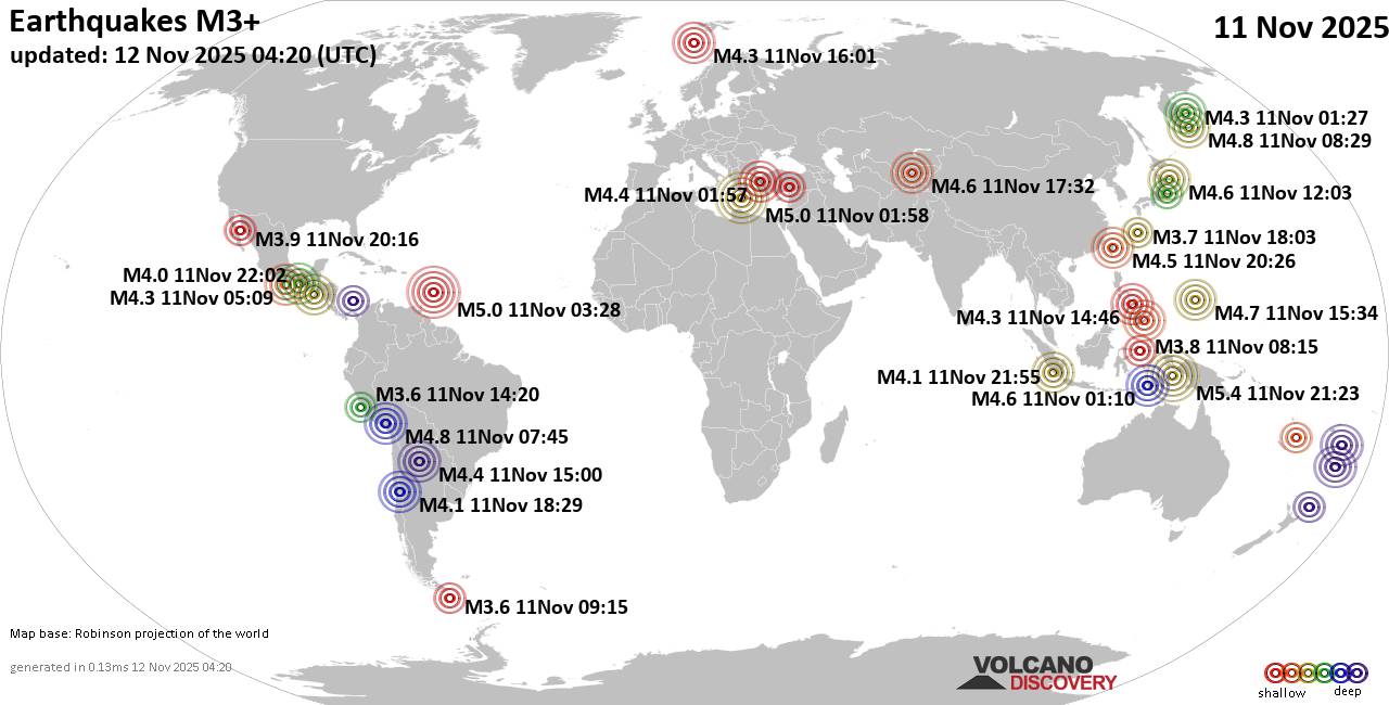 World Earthquake Report for Tuesday, 11 November 2025 Worldwide earthquakes above magnitude 3 during the past 24 hours on 12 Nov 2025 Summary: 3 quakes 5.0+, 38 quakes 4.0+, 192 quakes 3.0+, 474 quakes 2.0+ (707 total)Magnitude 5+: 3 earthquakes Magnitude 4+: 38 earthquakes Magnitude 3+: 192 earthquakes Magnitude 2+: 474 earthquakes No quakes of magnitude 6 or higher 10 largest earthquakes in the world (11 Nov 2025)Wednesday, Nov 12, 2025, at 06:23 am (GMT +9) - Tuesday, Nov 11, 2025, at 03:58 am (GMT +2) - Monday, Nov 10, 2025, at 11:28 pm (GMT -4) - Tuesday, Nov 11, 2025, at 03:12 am (GMT -12) - Tuesday, Nov 11, 2025, at 02:45 am (Lima time) - Tuesday, Nov 11, 2025, at 07:29 pm (GMT +11) - Wednesday, Nov 12, 2025, at 12:34 am (GMT +9) - Tuesday, Nov 11, 2025, at 10:32 pm (Tashkent time) - Tuesday, Nov 11, 2025, at 09:03 pm (GMT +9) - Tuesday, Nov 11, 2025, at 10:10 am (Jayapura time) - Earthquakes reported feltTuesday, Nov 11, 2025, at 10:32 pm (Tashkent time) - Tuesday, Nov 11, 2025, at 03:58 am (GMT +2) - Monday, Nov 10, 2025, at 11:09 pm (GMT -6) - Monday, Nov 10, 2025, at 11:28 pm (GMT -4) - Tuesday, Nov 11, 2025, at 10:46 pm (Manila time) - Tuesday, Nov 11, 2025, at 06:08 am (Istanbul time) - Tuesday, Nov 11, 2025, at 11:51 pm (Manila time) - Tuesday, Nov 11, 2025, at 01:27 pm (Kamchatka time) - Tuesday, Nov 11, 2025, at 03:29 pm (Santiago time) - Wednesday, Nov 12, 2025, at 12:25 am (Istanbul time) - Wednesday, Nov 12, 2025, at 04:01 am (Manila time) - Tuesday, Nov 11, 2025, at 03:40 am (Istanbul time) - Tuesday, Nov 11, 2025, at 07:29 pm (GMT +11) - Monday, Nov 10, 2025, at 08:36 pm (Mexico City time) - Tuesday, Nov 11, 2025, at 10:29 am (Athens time) - Earthquake stats  https://www.volcanodiscovery.com/earthquake/news/286719/World-Earthquake-Report-for-Tuesday-11-November-2025.html