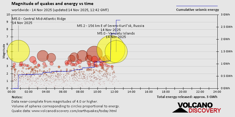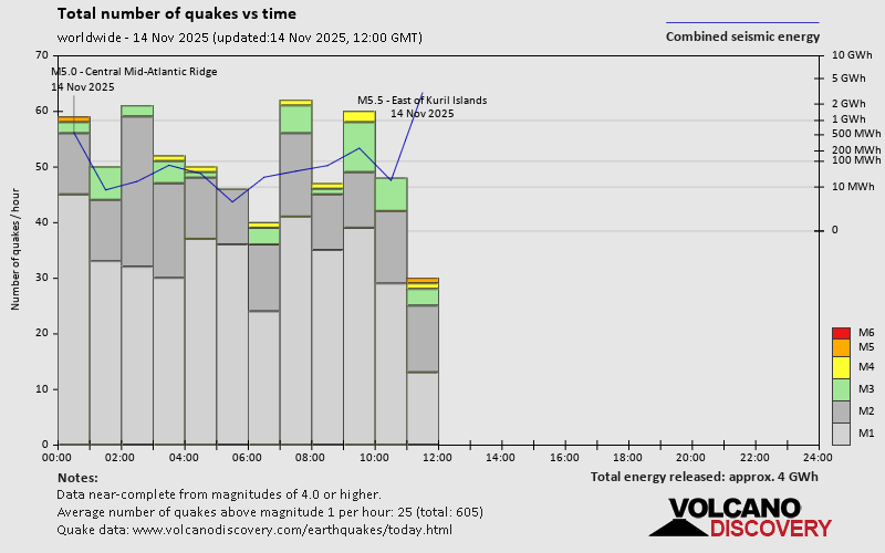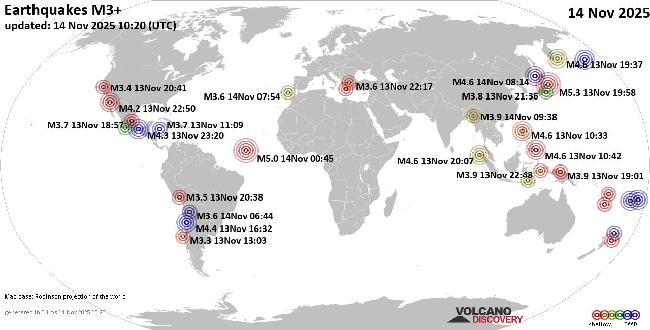 World Earthquake Report for Friday, 14 November 2025 Worldwide earthquakes above magnitude 3 during the past 24 hours on 14 Nov 2025 Summary: 2 quakes 5.0+, 21 quakes 4.0+, 129 quakes 3.0+, 377 quakes 2.0+ (529 total)This report is being updated every hour.Magnitude 5+: 2 earthquakes Magnitude 4+: 21 earthquakes Magnitude 3+: 129 earthquakes Magnitude 2+: 377 earthquakes No quakes of magnitude 6 or higher 10 largest earthquakes in the world (past 24 hours)Friday, Nov 14, 2025, at 05:58 am (GMT +10) - Thursday, Nov 13, 2025, at 10:45 pm (GMT -2) - Friday, Nov 14, 2025, at 07:37 am (GMT +12) - Thursday, Nov 13, 2025, at 06:42 pm (GMT +8) - Thursday, Nov 13, 2025, at 06:33 pm (Manila time) - Friday, Nov 14, 2025, at 05:14 pm (GMT +9) - Friday, Nov 14, 2025, at 03:07 am (Jakarta time) - Friday, Nov 14, 2025, at 09:59 am (Fiji time) - Friday, Nov 14, 2025, at 11:56 am (Kamchatka time) - Friday, Nov 14, 2025, at 07:11 am (GMT +13) - Earthquakes reported feltThursday, Nov 13, 2025, at 12:41 pm (Los Angeles time) - Thursday, Nov 13, 2025, at 03:55 pm (Nicosia time) - Friday, Nov 14, 2025, at 01:16 am (Amsterdam time) - Friday, Nov 14, 2025, at 03:10 am (Nicosia time) - Friday, Nov 14, 2025, at 12:17 am (Athens time) - Thursday, Nov 13, 2025, at 12:41 pm (Santo Domingo time) - Thursday, Nov 13, 2025, at 08:58 pm (Rome time) - Friday, Nov 14, 2025, at 01:03 am (Makassar time) - Thursday, Nov 13, 2025, at 06:42 pm (GMT +8) - Thursday, Nov 13, 2025, at 02:50 pm (Tijuana time) - Friday, Nov 14, 2025, at 09:42 am (Manila time) - Thursday, Nov 13, 2025, at 06:33 pm (Manila time) - Friday, Nov 14, 2025, at 12:10 am (Los Angeles time) - Thursday, Nov 13, 2025, at 10:03 pm (Rome time) - Friday, Nov 14, 2025, at 09:32 am (GMT +11) - Friday, Nov 14, 2025, at 07:37 am (GMT +12) - Thursday, Nov 13, 2025, at 07:23 am (Santiago time) - Thursday, Nov 13, 2025, at 12:31 pm (Nicosia time) - Friday, Nov 14, 2025, at 05:58 am (GMT +10) - Friday, Nov 14, 2025, at 11:56 am (Kamchatka time) - Earthquake stats  https://www.volcanodiscovery.com/earthquake/news/286945/World-Earthquake-Report-for-Friday-14-November-2025.html