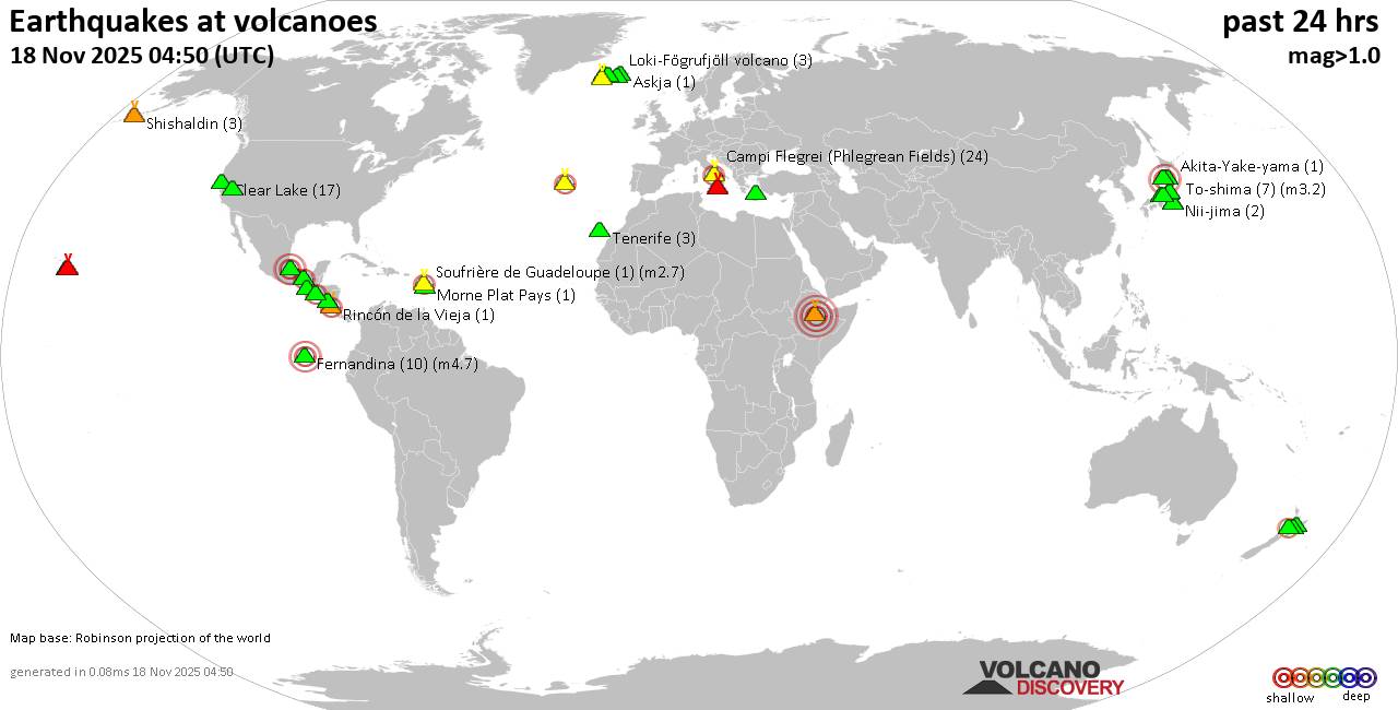 Volcano earthquake report for Tuesday, 18 Nov 2025 World map showing volcanoes with shallow (less than 50 km) earthquakes within 20 km radius during the past 24 hours on 18 Nov 2025 Number in brackets indicate nr of quakes. Quakes detected near: Akagi (2 quakes between mag 0.4-1.3), Akita-Yake-yama (1 quake mag 1.0), Apaneca Range (2 quakes between mag 2.3-2.5), Askja (1 quake mag 1.0), Campi Flegrei (Phlegrean Fields) (20 quakes between mag 0.1-2.4), Clear Lake (20 quakes between mag 0.3-2.9) El Chichón (7 quakes between mag 2.0-3.0), Etna (9 quakes between mag 1.6-2.6), Fantale (1 quake mag 4.7), Fernandina (10 quakes between mag 2.6-4.7), Haku-san (4 quakes between mag 0.3-1.9), Kilauea (2 quakes between mag 1.7-1.9), Kolumbo (4 quakes between mag 1.2-1.8), La Palma (2 quakes between mag 1.1-1.5), Ljósufjöll (5 quakes between mag 0.0-1.7), Loihi (1 quake mag 1.8), Loki-Fögrufjöll volcano (6 quakes between mag 0.4-2.6), Long Valley (1 quake mag 1.1), Maunaloa (1 quake mag 1.3), Megata (1 quake mag 3.0), Morne Plat Pays (1 quake mag 1.5), Nantai (2 quakes between mag 0.4-1.1), Nejapa-Miraflores (2 quakes between mag 3.0-3.0), Nii-jima (1 quake mag 1.1), Norikura (1 quake mag 1.0), Platanar (1 quake mag 1.4), Prestahnukur (1 quake mag 1.4), Rincón de la Vieja (1 quake mag 2.2), Ruapehu (2 quakes between mag 0.6-1.2), Shishaldin (3 quakes between mag 0.9-1.6), Soufrière de Guadeloupe (1 quake mag 2.7), Svartsengi (1 quake mag 1.3), Tacana (1 quake mag 3.0), Taranaki (2 quakes between mag 2.0-2.7), Taupo (1 quake mag 1.5), Telica (1 quake mag 1.4), Tenerife (4 quakes between mag 0.7-1.2), Terceira (3 quakes between mag 2.0-2.3), To-shima (7 quakes between mag 1.7-3.2), Yake-dake (7 quakes between mag 0.1-2.0) (updated 01h50) Note: Earthquakes within 20 km from and at depths less than 50 km under active volcanoes are reported. The list is not complete because many volcanoes are not monitored and/or seismic data in high resolution is not available publicly.
