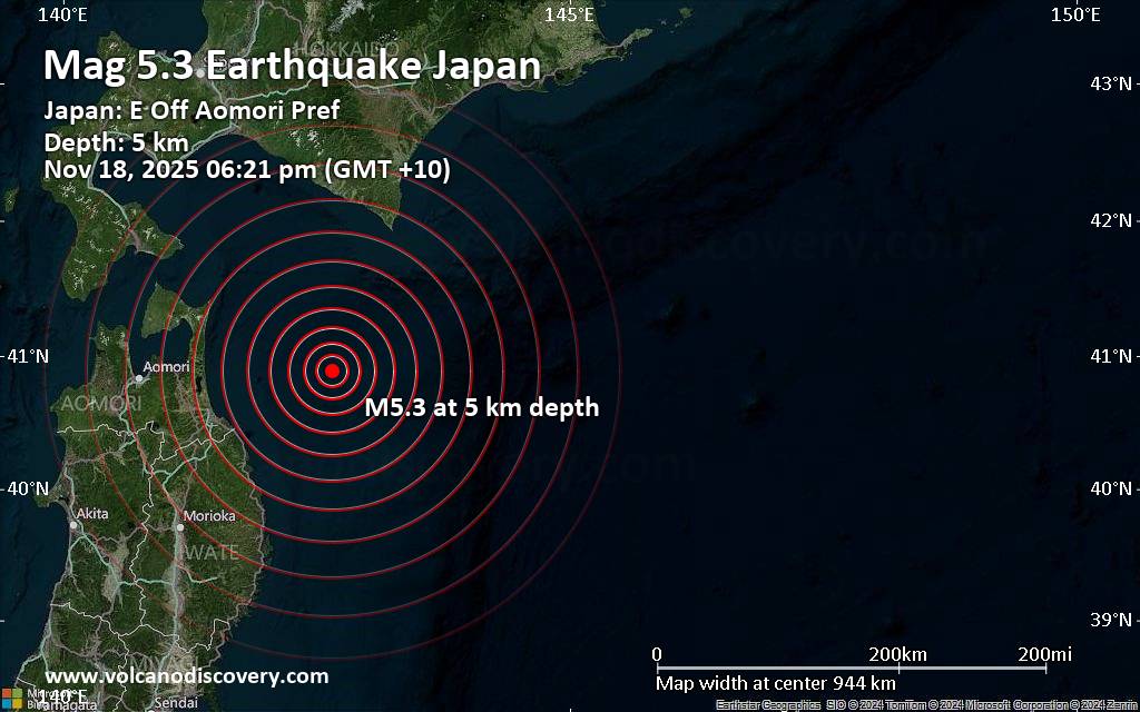 Magnitude 5.3 earthquake strikes near Hachinohe, Hachinohe Shi, Aomori, Japan Just 9 minutes ago, a 5.3-magnitude earthquake struck near Hachinohe, Hachinohe Shi, Aomori, Japan. The tremor was recorded early evening on Tuesday, November 18th, 2025, at 6:21 pm local time, at a very shallow depth of 4.60 km below the surface. The event was filed by Japan's National Research Institute for Earth Science and Disaster Resilience (NIED), the first seismological agency to report it. Our monitoring service identified a second report from the citizen-seismograph network of RaspberryShake which listed the quake at magnitude 4.7. Based on the preliminary seismic data, the quake should not have caused any significant damage, but was probably felt by many people as light vibration in the area of the epicenter. Weak shaking might have been felt in Hitokawame (pop. 24,300) located 105 km from the epicenter, Hachinohe (pop. 239,000) 106 km away, Kuji (pop. 34,400) 108 km away, Misawa (pop. 42,800) 109 km away, Towada (pop. 60,700) 125 km away, and Mutsu (pop. 56,200) 128 km away. VolcanoDiscovery will automatically update magnitude and depth if these change and follow up if other significant news about the quake become available. If you’re in the area, please send us your experience through our reporting mechanism, either online or via our mobile app. This will help us provide more first-hand updates to anyone around the globe who wants to know more about this quake.