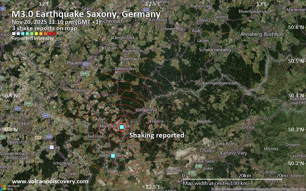 Earthquake data: Date & time: Nov 20, 2025 11:10 pm (GMT +1) local time (20 Nov 2025 22:10 GMT)Magnitude: unspecified Depth: unspecified Epicenter latitude / longitude: 50.31°N / 12.36°E  ( Saxony, Germany) Primary data source: VolcanoDiscoveryhttps://www.volcanodiscovery.com/earthquake/news/287375/Seismic-like-event-possible-earthquake-reported-few-minutes-ago-near-Plauen-Saxony-Germany.html