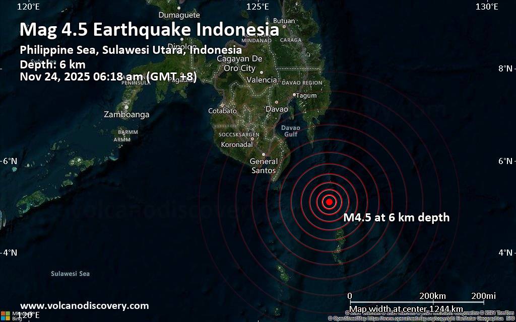 Earthquake data: Date & time: Nov 24, 2025 06:18 am (GMT +8) local time (23 Nov 2025 22:18 GMT)Magnitude: 4.5 Depth: 6.00 km Epicenter latitude / longitude: 5.11°N / 126.56°E  ( Sulawesi Utara, Indonesia) Primary data source: PHIVOLCShttps://www.volcanodiscovery.com/earthquake/news/287671/Moderate-magnitude-45-earthquake-49-km-south-of-Miangas-Indonesia.html